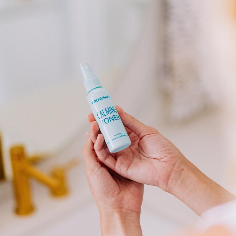 Experience the amazing effects of witch hazel and aloe vera by using our Calming Toner either on its own or alongside our other Frownies skincare products!