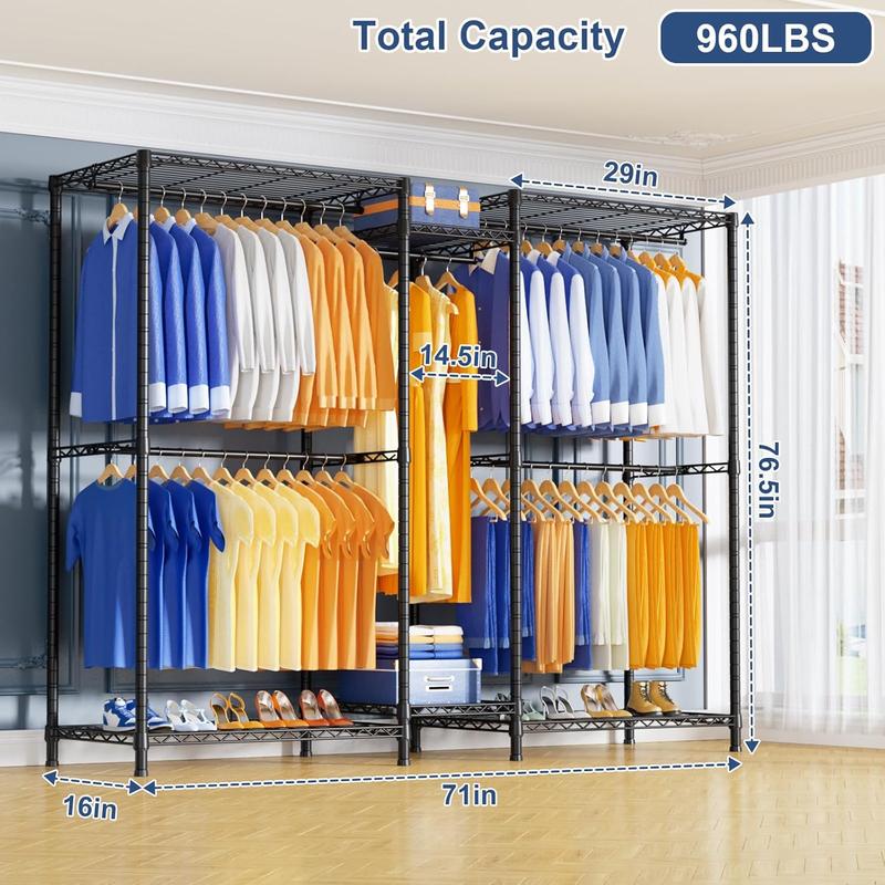 ·▶【STURDY & RELIABLE】Garment rack made of high quality carbon steel,Makes it stable、sturdy and reliable,Not easy to tip over,Portable closets for hanging clothes adopt high quality black coating to protect it from water and rust,Weight Capacity:Total 960lbs ,The middle of two small shelf also enhances the stability of the closet organizer system when using,The two shelf can be disassembled,So that you get two independent clothes rack,Which can be used in different scenarios according to your needs and storage different items!