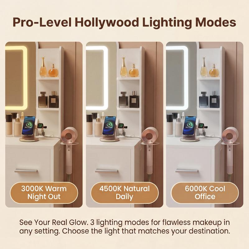【Lighted Mirror in 3 Lighting Modes】The Makeup table is equipped with 11 bulbs and offers three different color modes, natural, warm and cool. Adjust the lighting to create the perfect atmosphere for your beauty routine.
