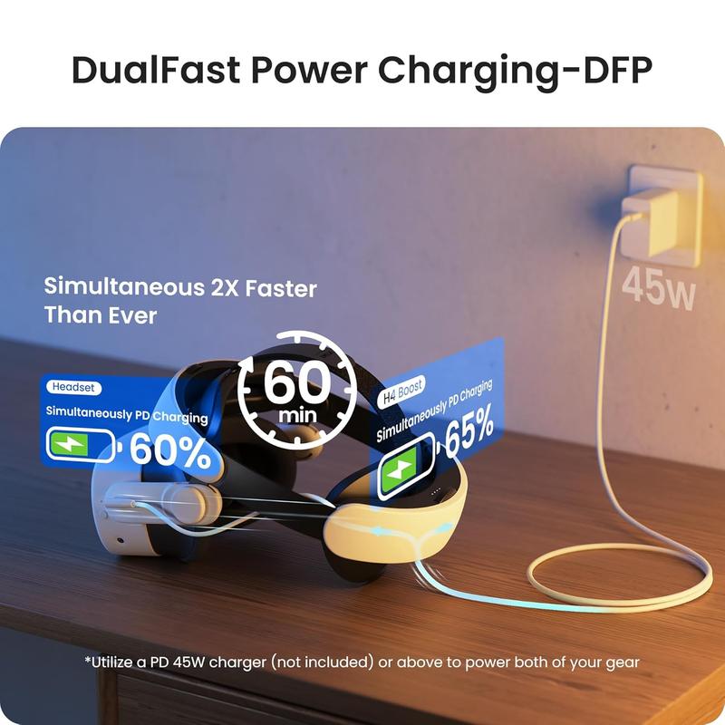 ·Dual Fast Charging; Two Times Faster: Power up both H4 Boost and Quest 3/3S simultaneously with DualBoost Charging system; fully charged in just 2.5 hours; 45W adapter delivers 25W output to Quest 3/3S; reach 65% charge(Both HMD&H4 Boost) in 60 minutes for 2.5 hours of playtime