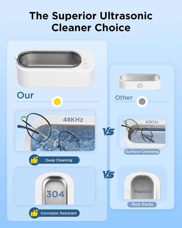 ·【Lightweight & Easy‑to‑Use Design】Weighing only 0.57kg, this ultrasonic cleaner is compact and portable for easy storage. Operation is simple with a one‑touch mode selector—no complicated settings required. It delivers consistent cleaning without the risk or effort of manual methods.
