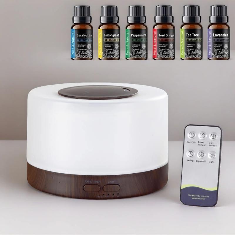 7-Color Wood Grain Diffuser 500ml | Essential Oil Humidifier with Remote Control, Auto Shut-Off & 6 Aromatherapy Oils