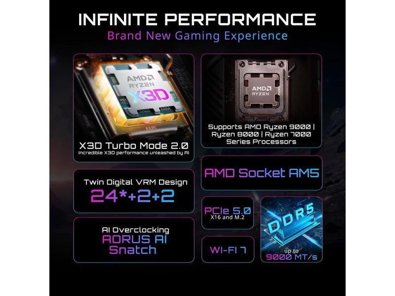 GIGABYTE X870E AORUS XTREME X3D AI TOP AMD AM5 LGA 1718, E-ATX, Supports AMD Ryzen 9000/8000/7000 Series Processors, DDR5, 24+2+2 Total Power Phase, 5x M.2, PCIe 5.0, USB4 Type-C, WIFI7, Dual 10GbE, PCIe EZ-Latch+ Duo, 5-Year Warranty