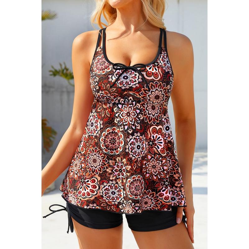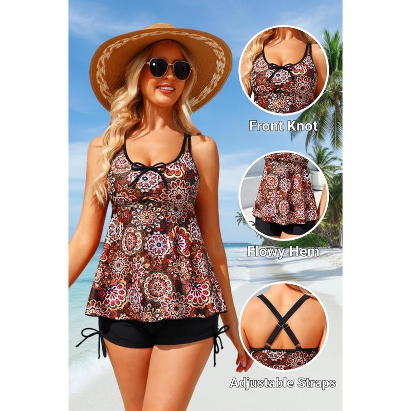 ·Stylish Flowy Tankini Set: This elegant Mandala two-piece swimsuit features a charming front bow and subtle ruching at the bust for a feminine touch. The flowy A-line hem, double straps, and crisscross back combine style with gentle support—ideal for beach days or poolside lounging.