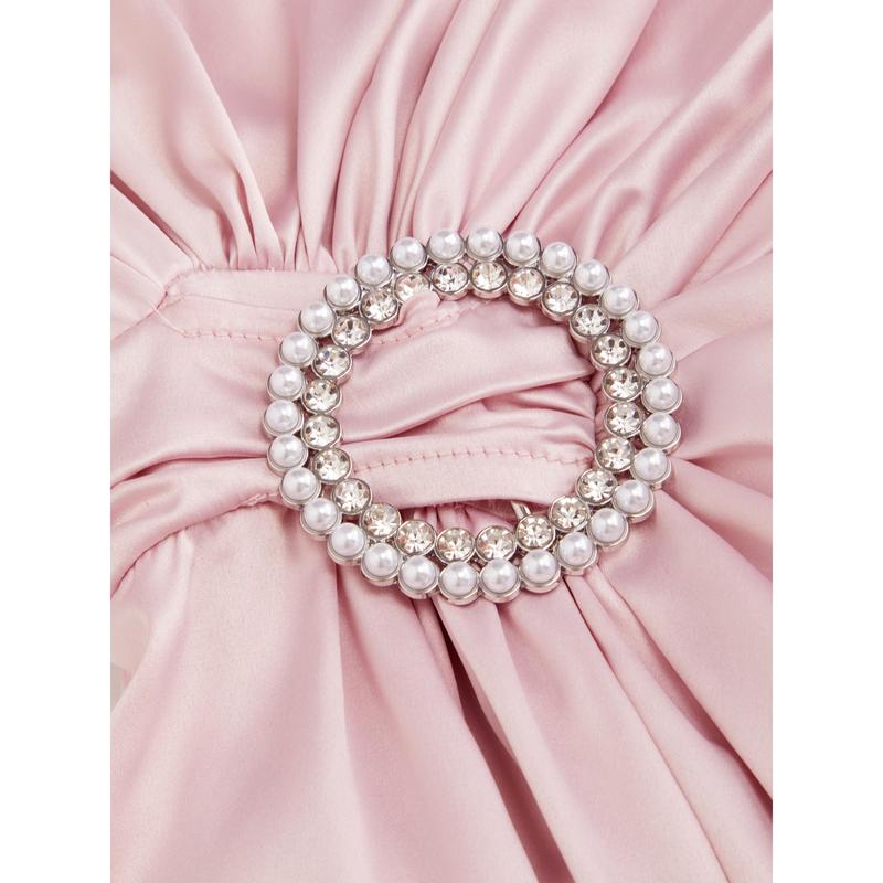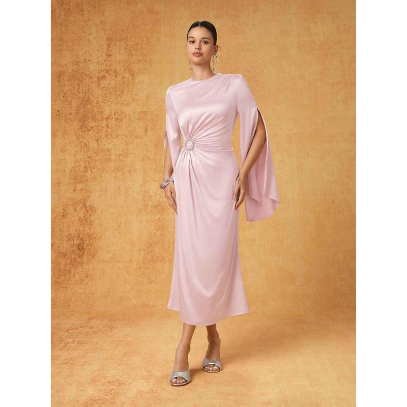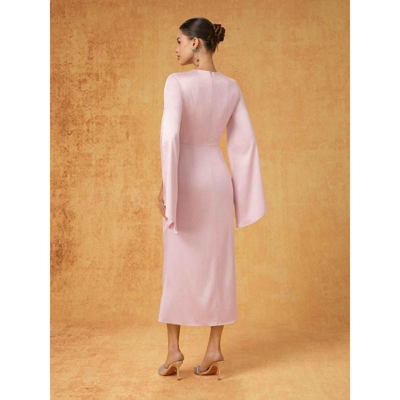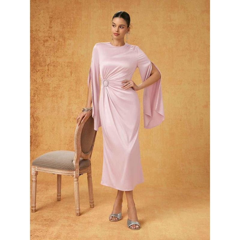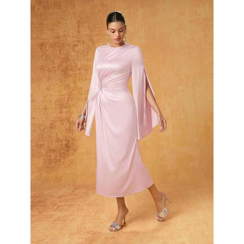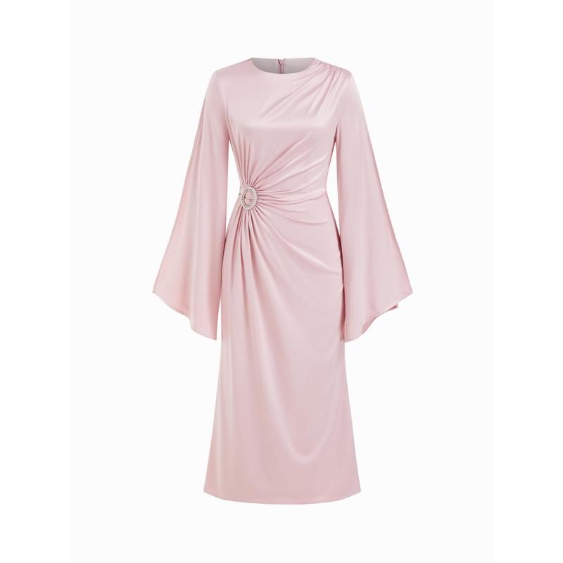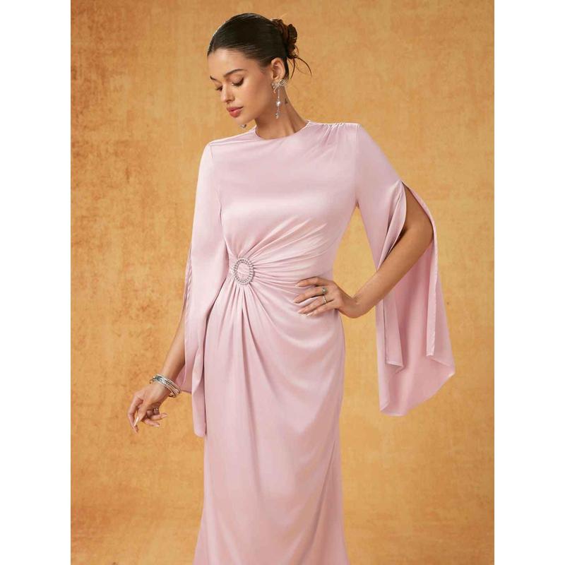 5. Cider Satin Rhinestone Ruched Bell Sleeve Maxi Dress