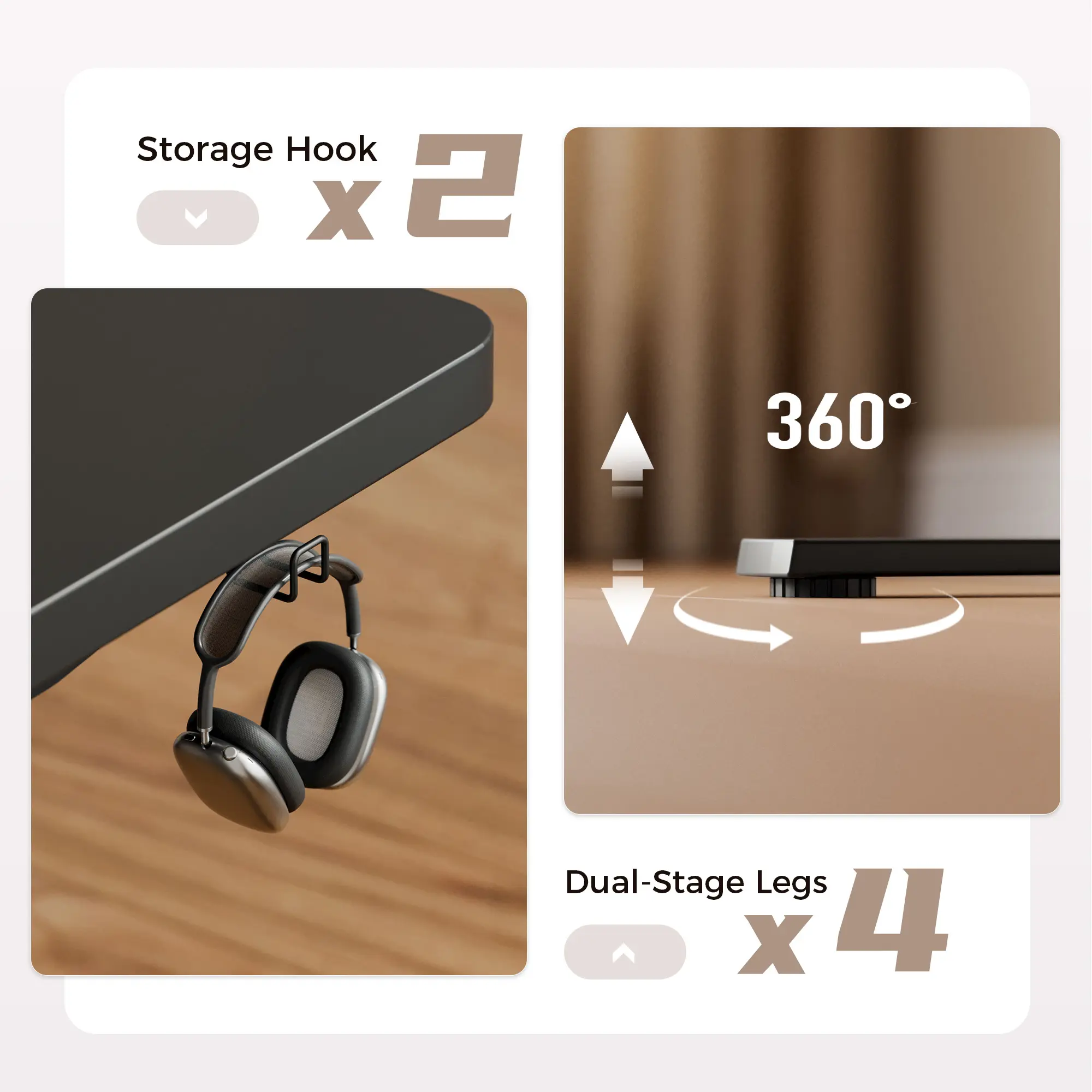 ·Integrated USB Charging & Organized Storage:Designed for modern work setups, this dual motor standing desk includes a USB charging port for convenient device charging and dual side hooks to hang headphones, bags, or daily essentials—enhancing both efficiency and workspace organization.