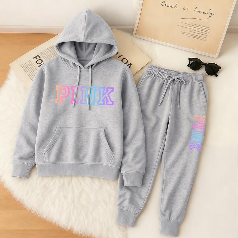 5. Women's Colorful PINK Print Hoodie And Drawstring Track Pants Set, Casual Sportswear, Long-Sleeved Hooded Jacket And Pants, Suitable For Autumn And Winter, Everyday Wear, Indoor And Outdoor Sportswear, Casual Sportswear