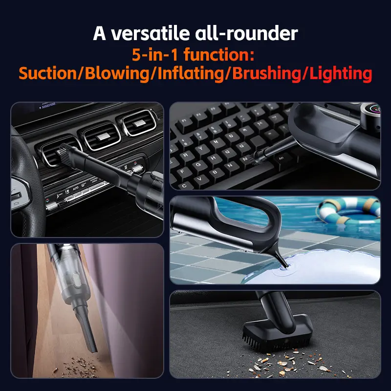 This isn’t just a vacuum—it’s your all-in-one cleaning solution. Switch seamlessly between Suction, Blowing, Inflating, Brushing, and Lighting modes to tackle every mess, from car interiors and keyboards to pool toys and hard-to-reach corners.