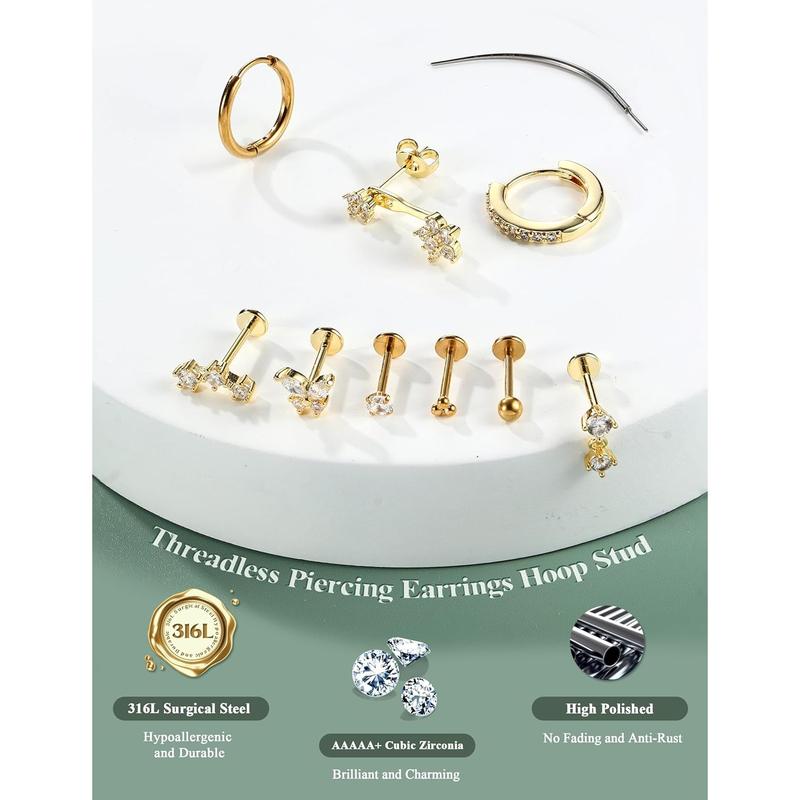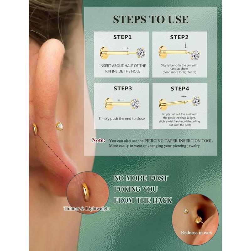 ·【316L Surgical Steel – Hypoallergenic & Fade-Free】 The threadless earrings set is crafted from medical-grade 316L surgical steel—nickel-free, lead-free, waterproof and tarnish-proof. These flat back earrings hypoallergenic are safe for new or healed piercings and all sensitive skin