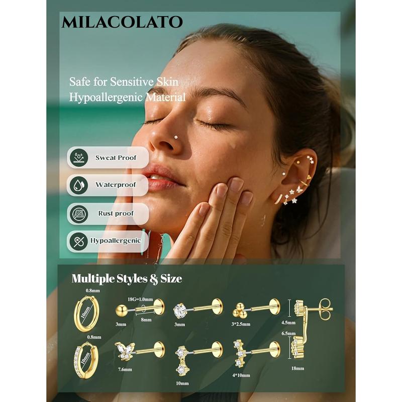 MILACOLATO Threadless Flat Back Earrings Hypoallergenic - 9 Pairs 316L Surgical Steel Push in CZ Studs & Hoops Set for Women Men 14K Plated Gold Cartilage Tragus Helix Nose Piercing Jewelry 16G 18G
