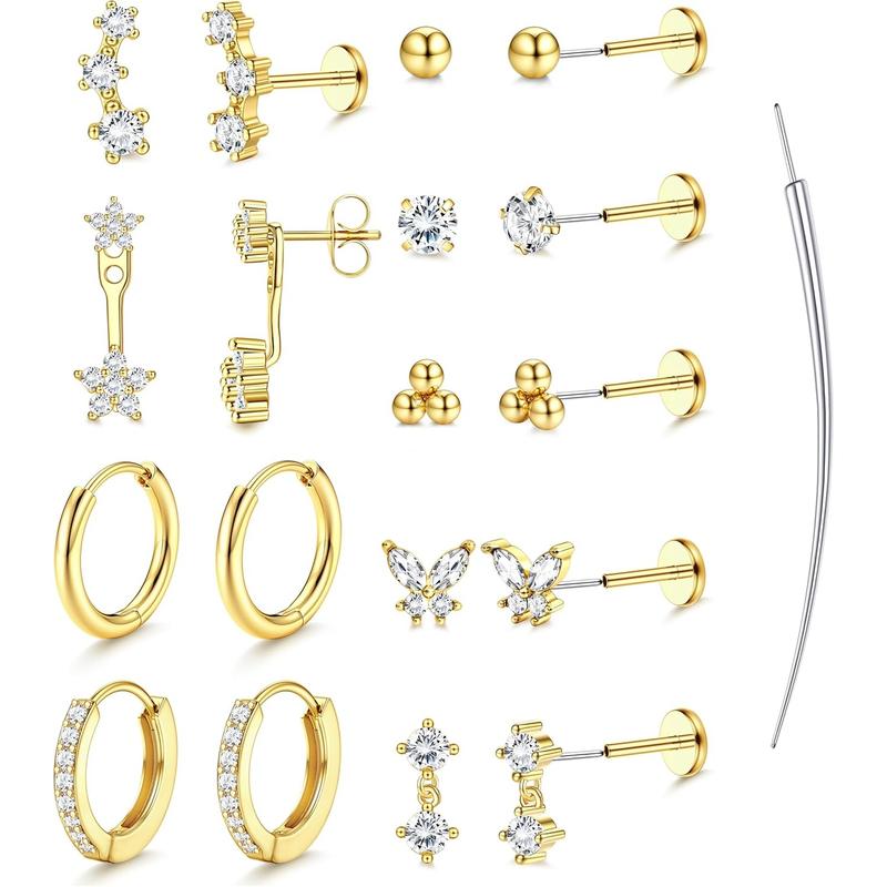 ·【9-Pair Curated-Ear Kit – 14 Flatback Stud Earrings + 4 Hoops + 1 Taper】 Instant collection of 14 sparkling flat back stud earrings and 4 dainty hoops plus a taper for effortless swaps. Mix-and-match cartilage earrings for women and men to create endless stacked looks
