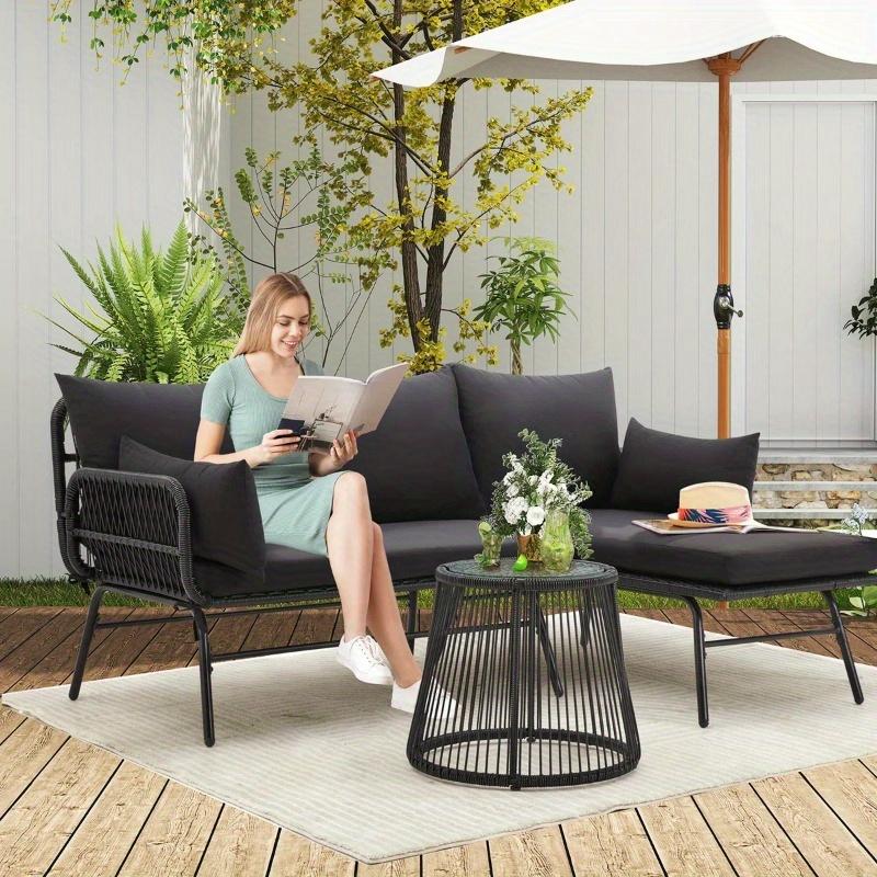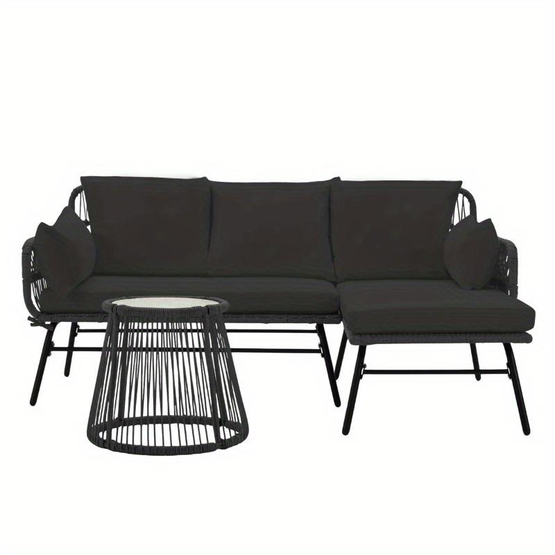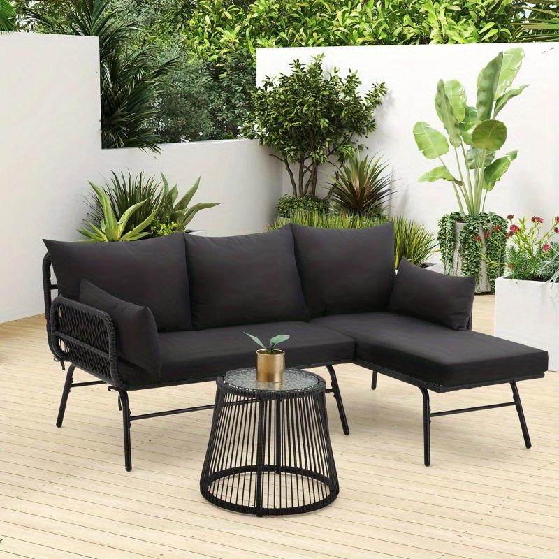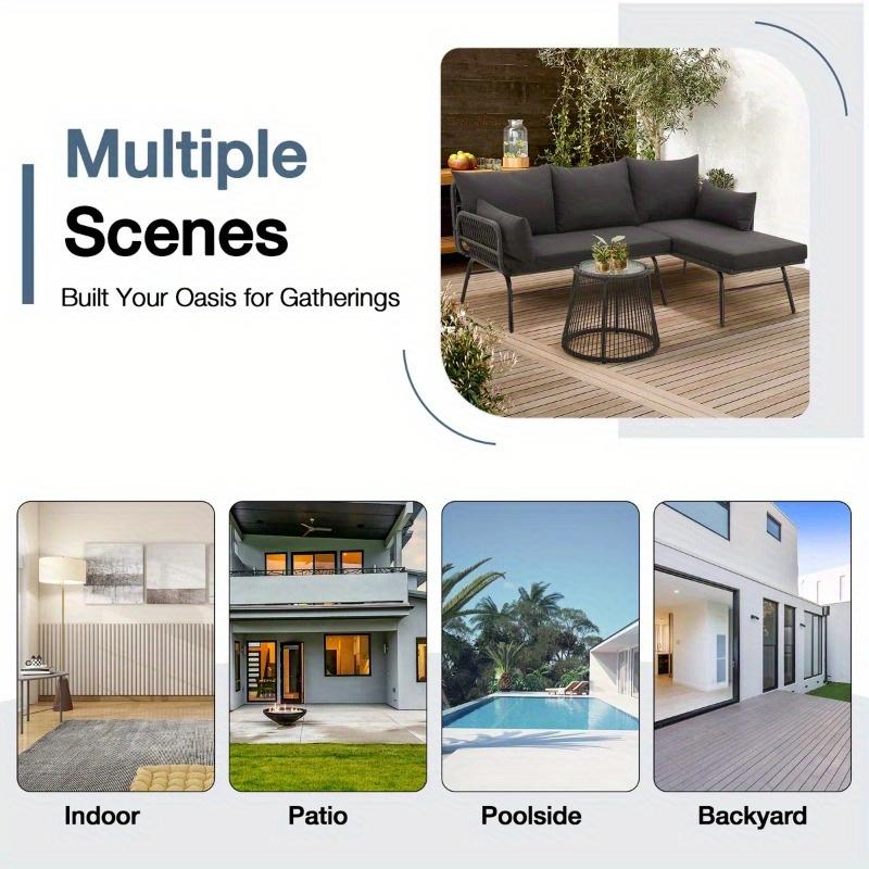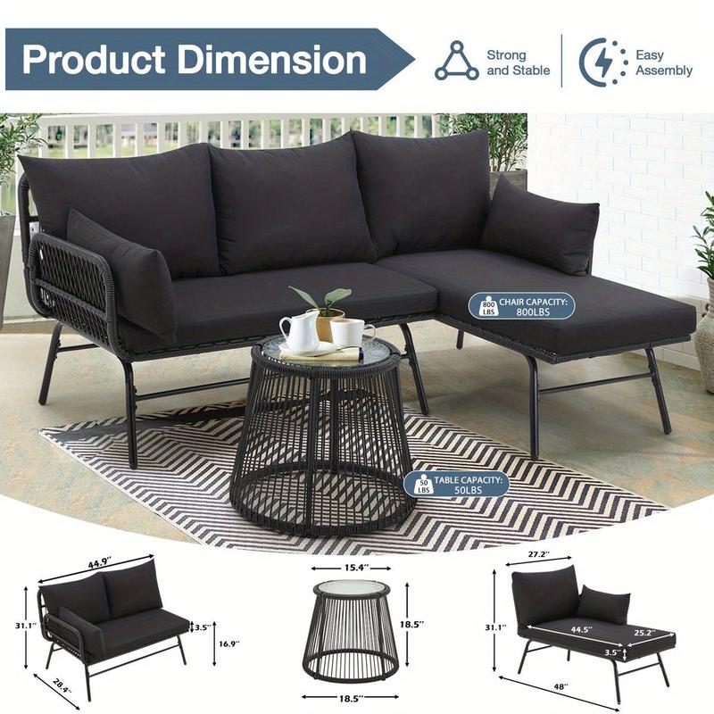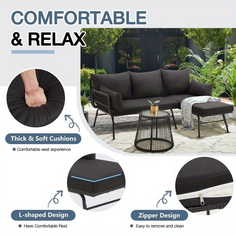 The modular L-shaped patio set offers versatile layout options. Configure it as a 3-person L-shaped chaise lounge with a loveseat for dining or socializing, or detach the lounger section to create a cozy 2-piece relaxation nook—perfect for adapting to any outdoor space.