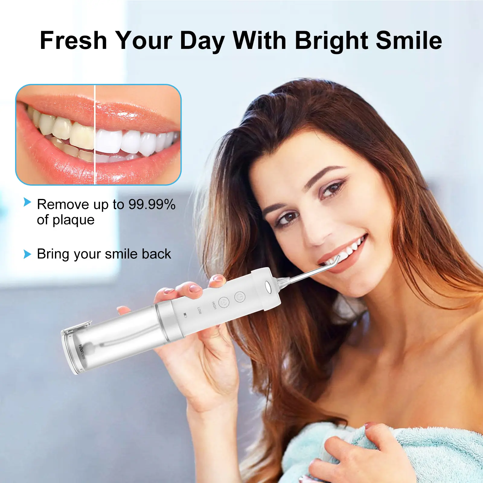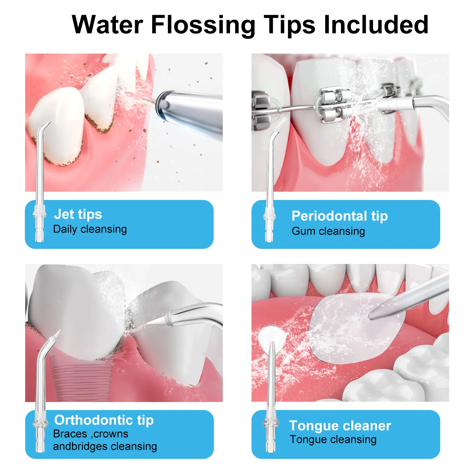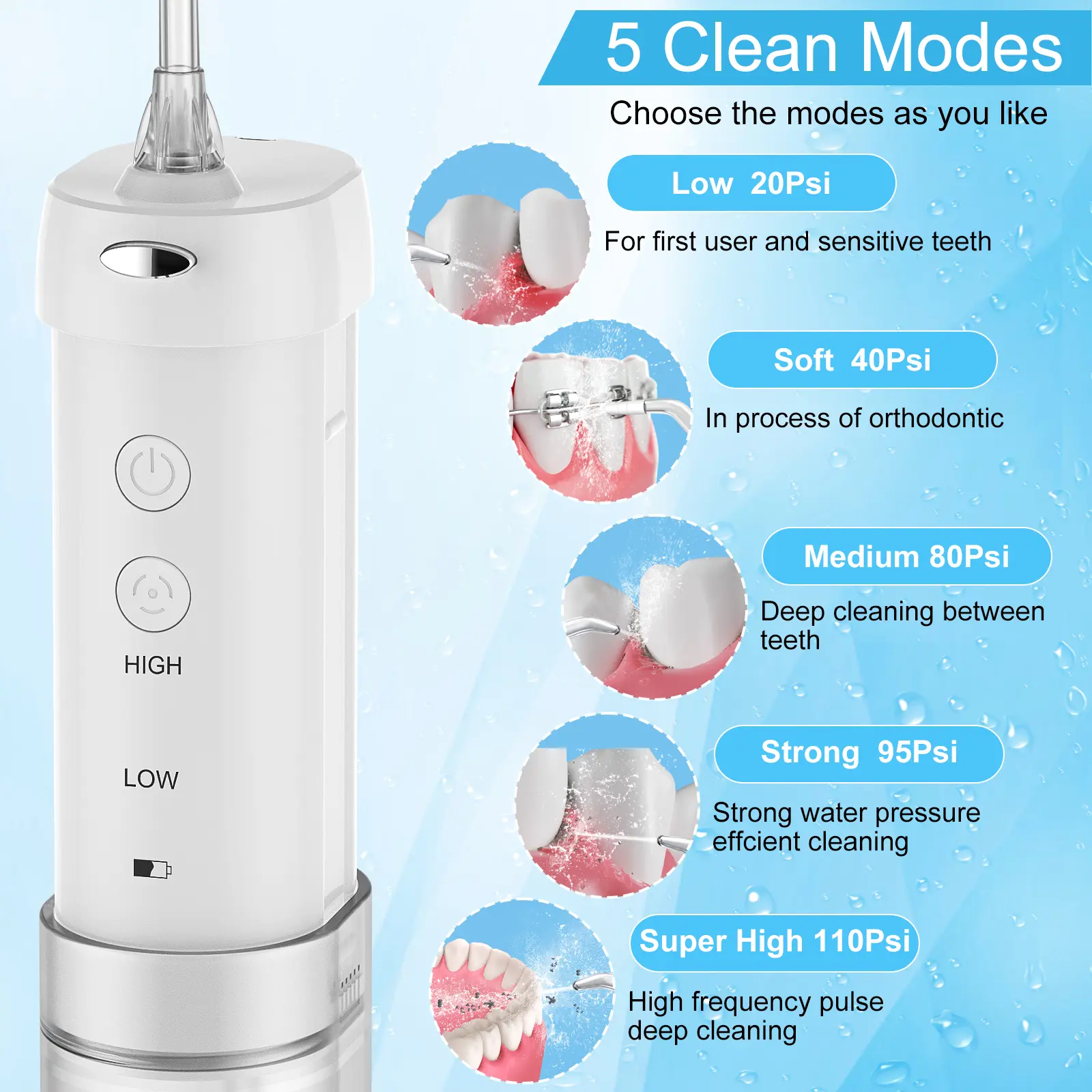 【Thorough Dental Cleaning & Oral Hygiene Care】H2ofloss dental irrigator is equipped with 1300 pulsesper minute and offers 5 optional water pressure modesranging from 40 to 140 Psi. This allows for customizedoral irrigation solutions based on individual oral healthconcerns.With a diameter of 0.7mm nozzles,7replaceable tips can be used for precise cleaning indifferent areas of the teeth,effectively addresses 6major oral issues including braces, periodontal and gum
