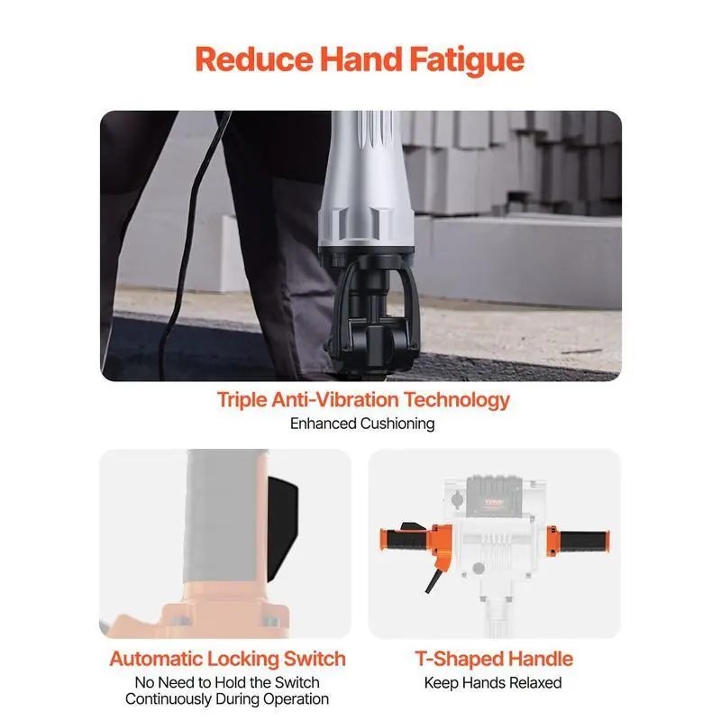 Easy to Handle: The T-shaped handle of our electric jack hammer provides a stable grip for greater control during operation, while the triple shock absorption system significantly reduces vibration, minimizing hand fatigue for a more comfortable working experience.