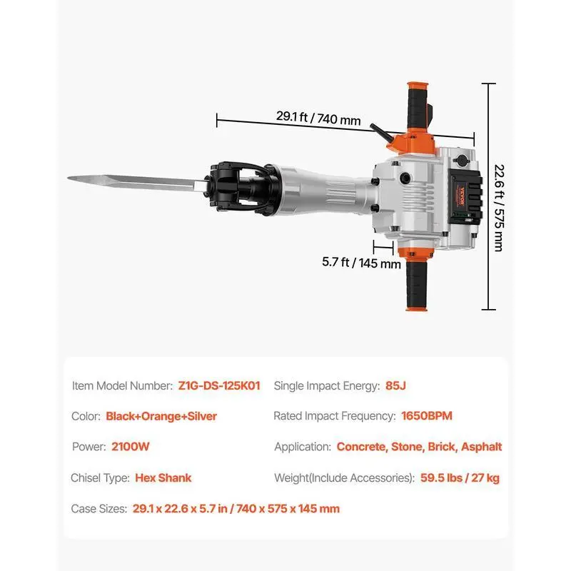 Outstanding Industrial Performance: Equipped with a powerful 2100W motor and delivering up to 1650 BPM impact frequency, our industrial-grade demolition jack hammer effortlessly breaks through tough materials like concrete, brick, and stone.