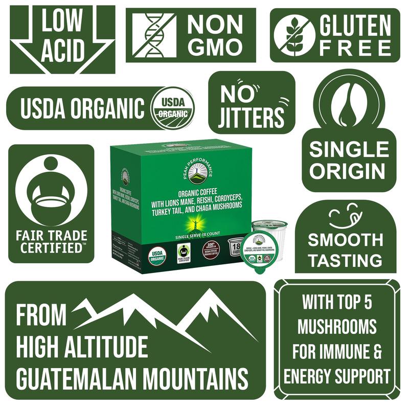 Experience the rich, smooth taste of Peak Performance Organic Mushroom Coffee Pods, a premium blend of high-altitude, single-origin Guatemalan Arabica coffee infused with Lion’s Mane, Reishi, Cordyceps, Turkey Tail, and Chaga mushrooms. Designed for those seeking a healthier coffee alternative, this blend delivers a full-bodied flavor with low acidity, making it a great option for individuals looking for a gentle-on-the-stomach coffee experience. Whether you're searching for a caffeine-balanced energy boost, a coffee that supports focus and mental clarity, or an organic mushroom coffee that aligns with your wellness routine, this thoughtfully crafted blend provides a delicious and functional way to start your day. Unlike conventional coffee, which can sometimes cause digestive discomfort, Peak Performance Mushroom Coffee Pods are formulated to be low in acid while maintaining a rich, balanced flavor. The combination of high-altitude Arabica beans and functional mushrooms creates a unique profile that is smooth, bold, and never bitter. This organic coffee is versatile enough to be enjoyed black or with your favorite milk, oat milk, almond milk, or creamer, allowing you to customize each cup to your preference. Each organic mushroom coffee pod is individually packaged for freshness, ensuring that the aroma and flavor remain intact until you're ready to brew. The airtight sealing helps extend the shelf life, so you can stock up without worrying about your coffee losing its potency over time. Our pods are precision-sealed to prevent leaks or bursts during brewing, ensuring a hassle-free experience with every cup. This makes them an excellent choice for use at home, in the office, or while traveling, providing a convenient way to enjoy a high-quality functional mushroom coffee wherever you go. Many coffee drinkers turn to mushroom coffee for focus, sustained energy, and enhanced cognitive performance. The adaptogenic properties of Lion’s Mane, Reishi, Cordyceps, Turkey Tail, and Chaga mushrooms have been traditionally recognized for their ability to support mental clarity, immune health, and overall well-being. Unlike regular coffee, which can lead to energy crashes, this blend is crafted to provide steady, long-lasting energy without the jitters or mid-day slumps. If you're looking for the best mushroom coffee for focus and performance, Peak Performance offers an exceptional solution that aligns with your active lifestyle. At Peak Performance, we believe in better coffee, better sourcing, and a better impact. Our organic mushroom coffee pods are made from USDA Certified Organic and Fair Trade Certified beans, ensuring that every cup meets the highest standards of quality and sustainability. The single-origin, high-altitude Arabica beans used in this blend develop a richer flavor and contain more antioxidants, enhancing both the taste and the benefits of your daily coffee ritual. Additionally, our 100% recyclable pods allow you to enjoy premium coffee while making an eco-friendly choice. For those looking for everyday dose mushroom coffee, best organic mushroom coffee, or functional mushroom coffee pods, Peak Performance delivers an exceptional coffee experience designed for both flavor and function. Whether you drink coffee for energy, mental clarity, wellness support, or as part of a balanced lifestyle, this organic mushroom coffee blend is the perfect choice. Enjoy a delicious, nutrient-rich brew that fuels your body and mind—one cup at a time.
