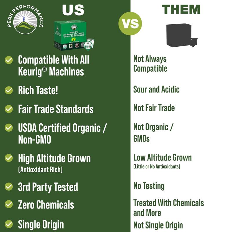 Compatible With All Devices - 100% Recyclable Coffee Pods - Fair Trade - Low Acid - USDA Certified Organic - Single Origin - High Altitude Guatemalan Coffee Pods carefully infused with Lion's Mane, Reishi, Cordyceps, Turkey Tail, Chaga Mushrooms for immune support, energy, performance, and brain boost without the jitters.
