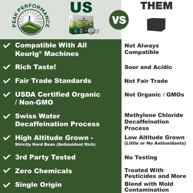 Unlike many decaf coffees that use methylene chloride in their decaffeination process, Peak Performance decaf coffee is decaffeinated by Swiss Water Process Decaffeinated Coffee, Inc. using a water-only process. Compatible With All Devices - 100% Recyclable 24 Count Decaf Coffee Pods, Fair Trade, USDA Certified Organic, Single Origin, and grown at High Altitude. If We Could Make This Coffee Any Healthier We Would! Compatible With K-CUP And Keurig Machines.