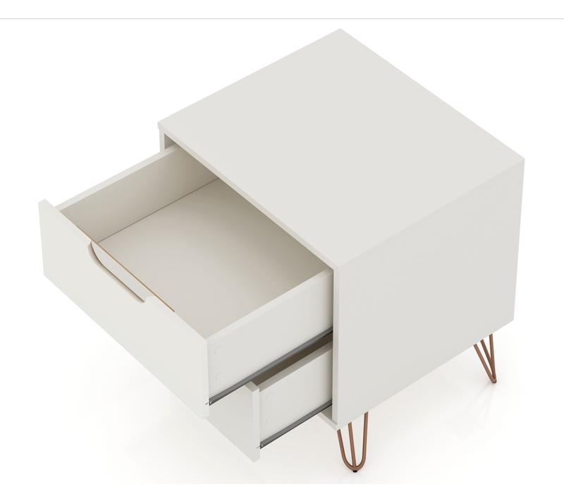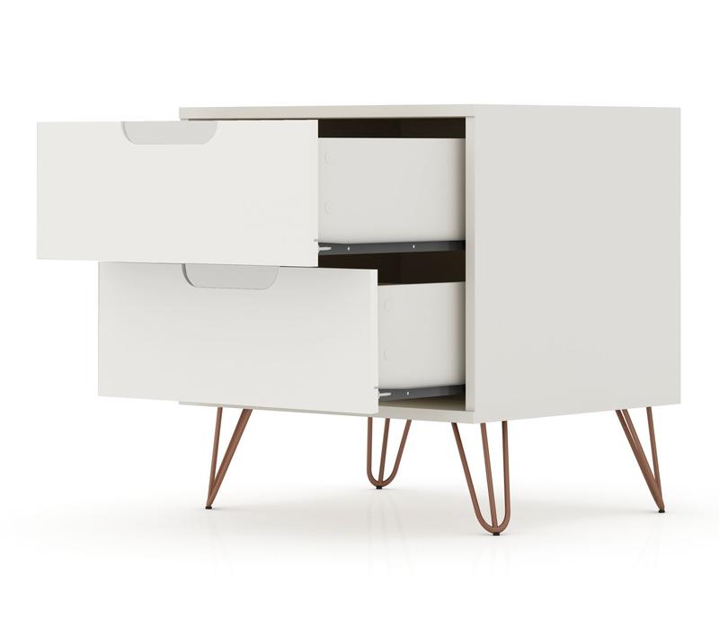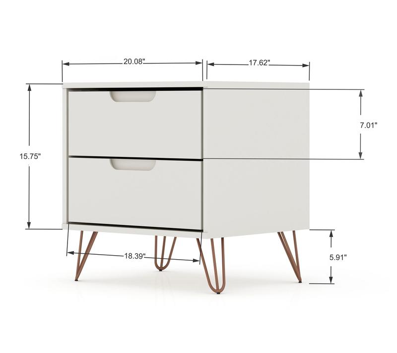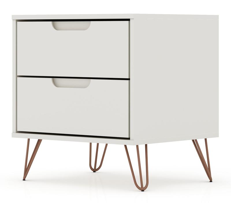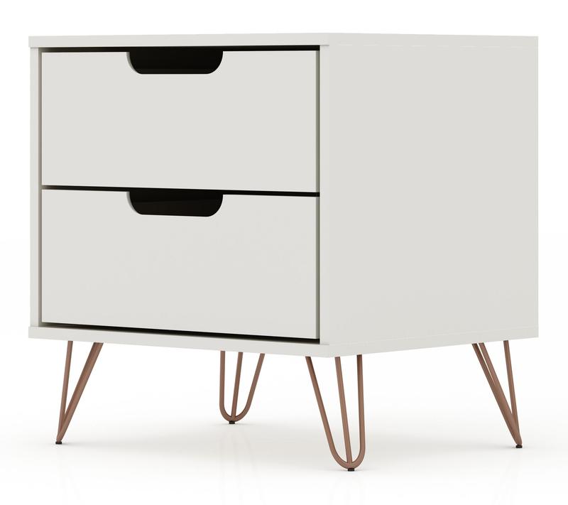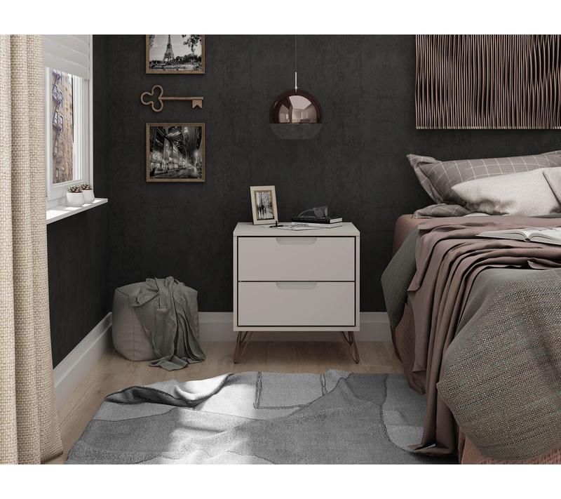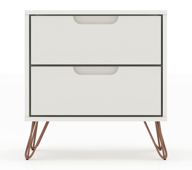 Whether you're catching up on late-night reading or need a stylish spot to stash essentials, this two-drawer nightstand adds both function and flair to your space. Sleek Mid-Century modern lines pair with splayed metal legs and customizable handles, blending seamlessly with your decor while offering handy storage right beside your bed. From Manhattan Comfort.