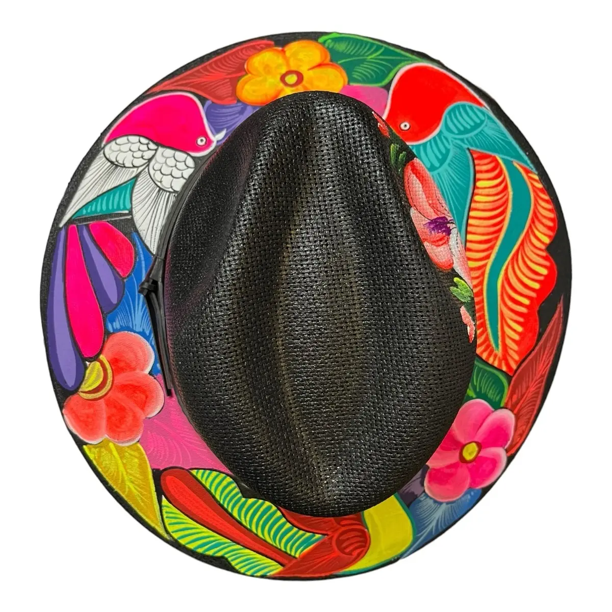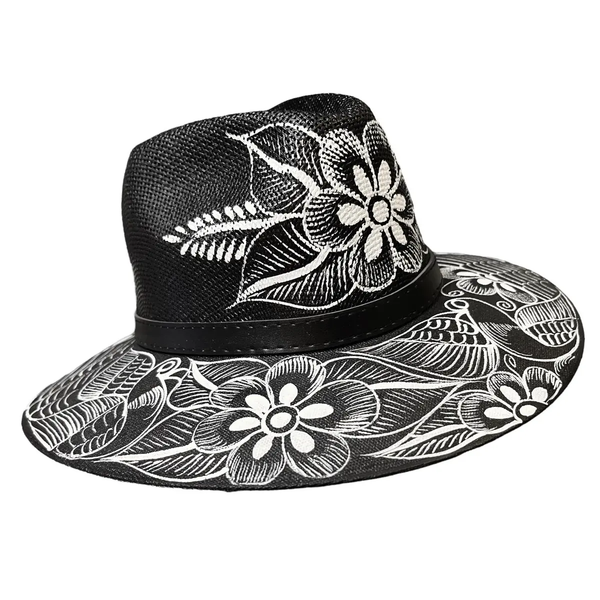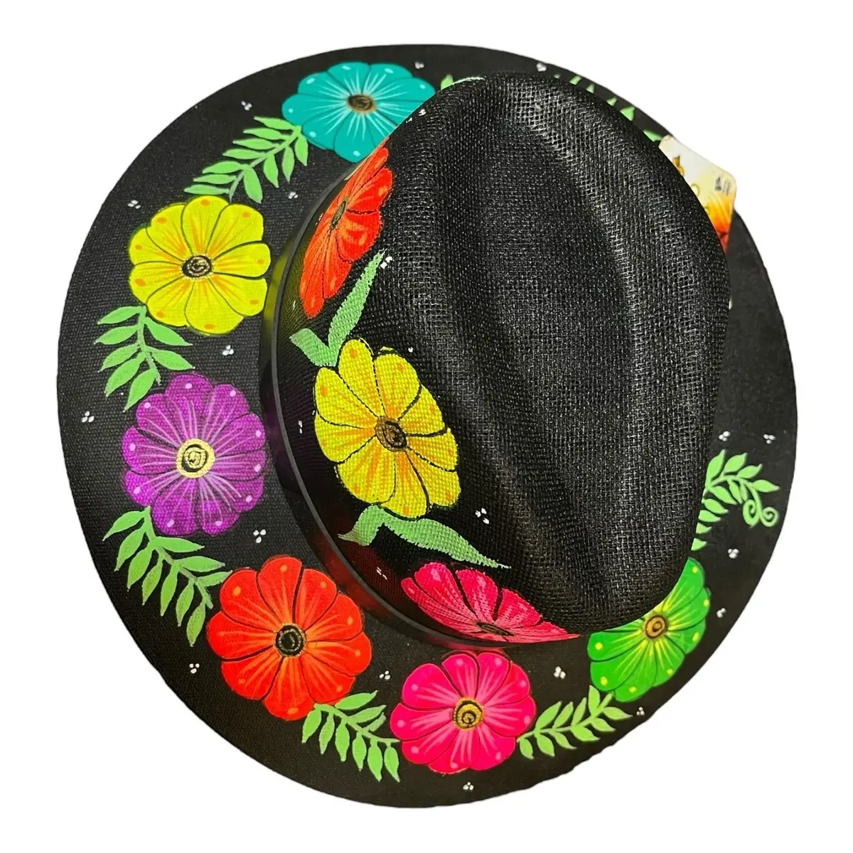 MEXICAN HAT Artisanal Hand Painted Fedora Floral Sombrero Panama Bohemian Black