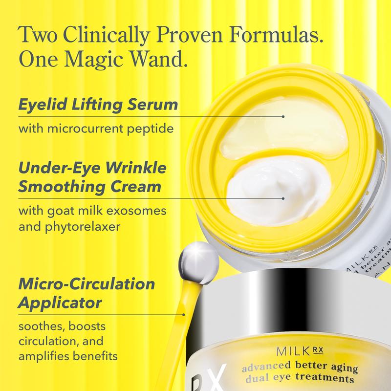 Milk RX Dual Eye Treatments features an under-eye wrinkle-smoothing cream and an eyelid lifting serum for full circle eye repair—with zero irritation.