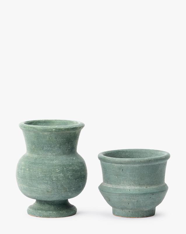 A sculptural duo with soft curves and a weathered, matte finish, these artisan-made vases bring understated character to any display. Their muted teal tone and timeless silhouettes make them effortless accents for branches, blooms, or styled shelves.