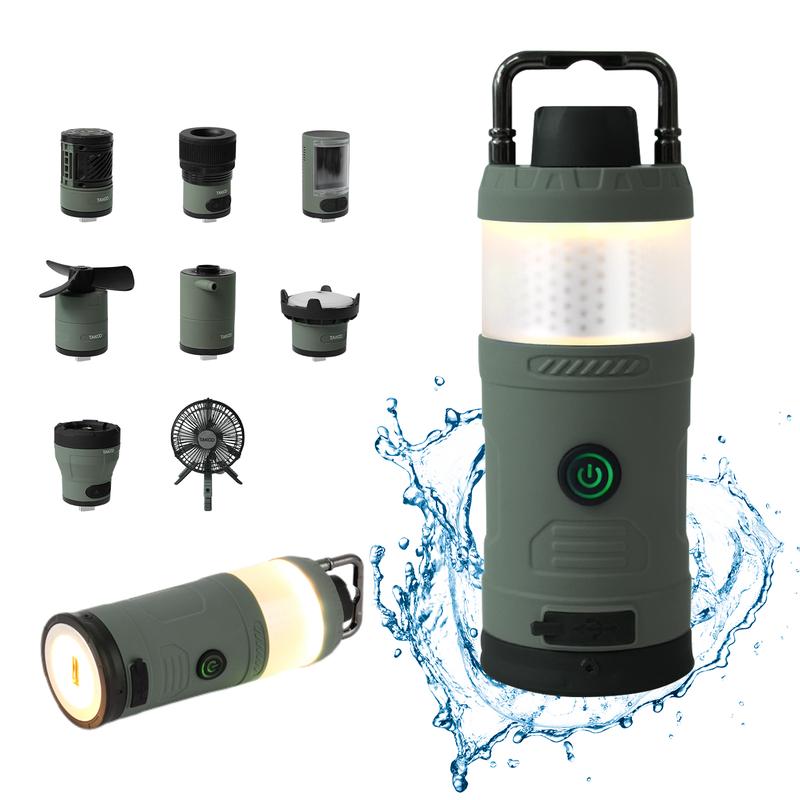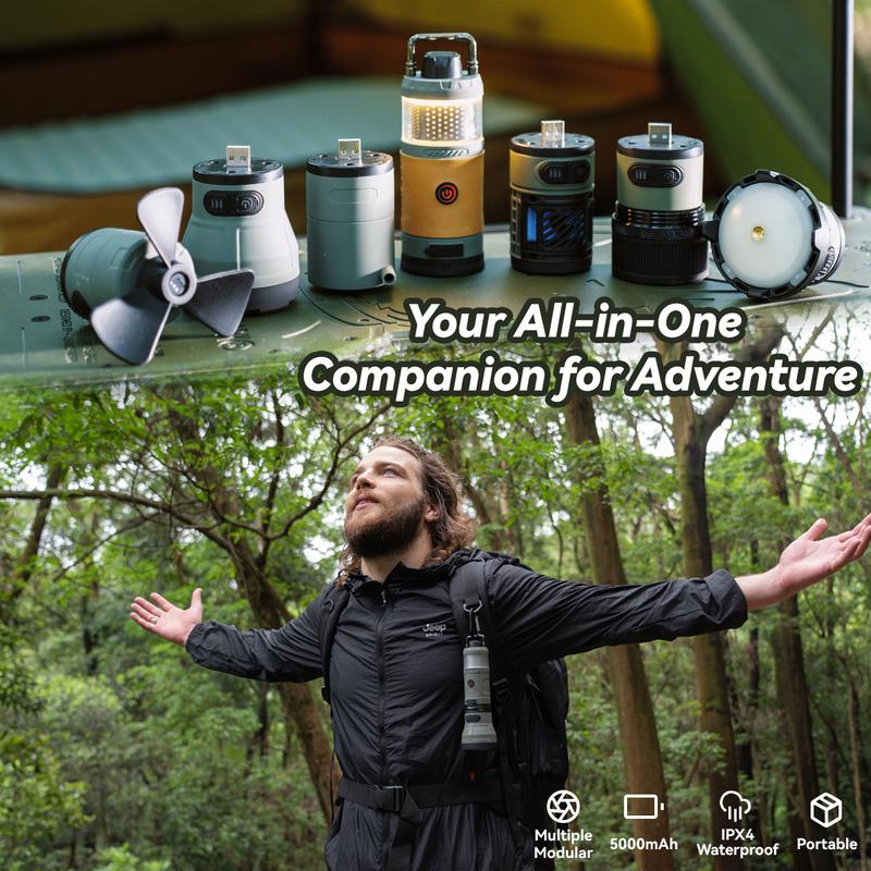 ·Multiple Essential Functions: Use it as a lantern, flashlight, floodlight, spotlight, fan, bluetooth speaker, and air pump — all with magnetic swappable modules.