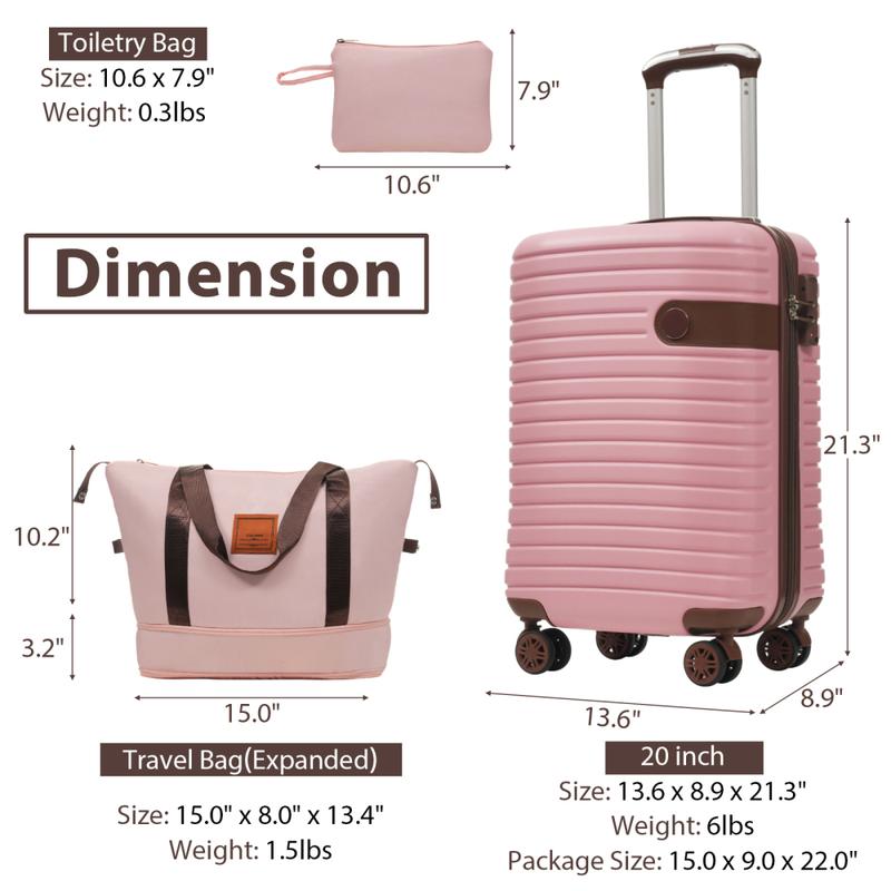 3 piece set offers a 20" luggage, a weekender travel bag and a toiletry bag. The 20-inch carry-on luggage meets the size requirements of most airlines - 22x14x9, allowing you to travel worry-free. Perfect for weekend getaways and short trips. 20-inch size:13.6"x 8.9"x 21.3".
