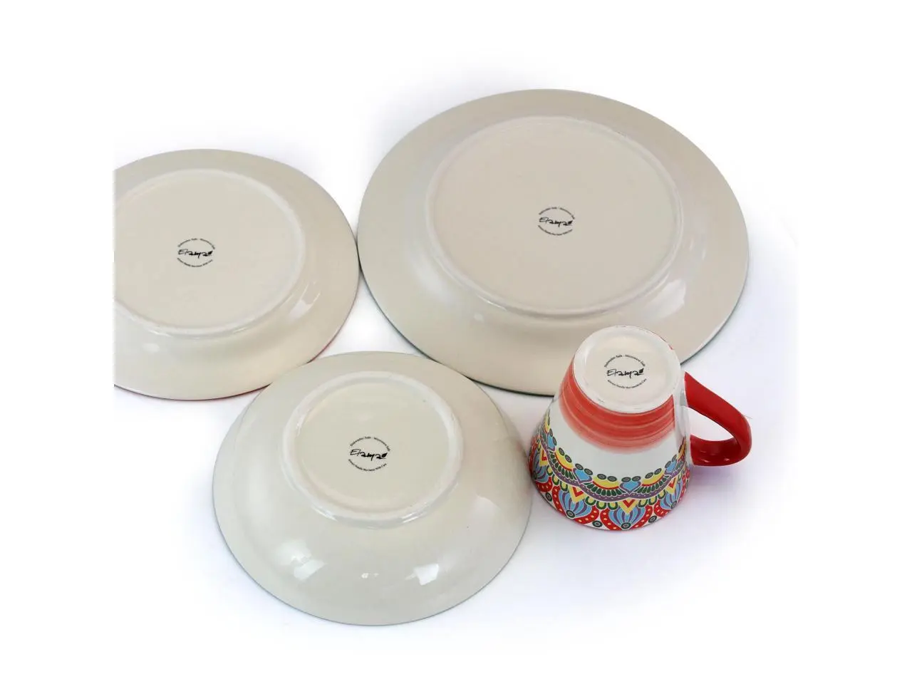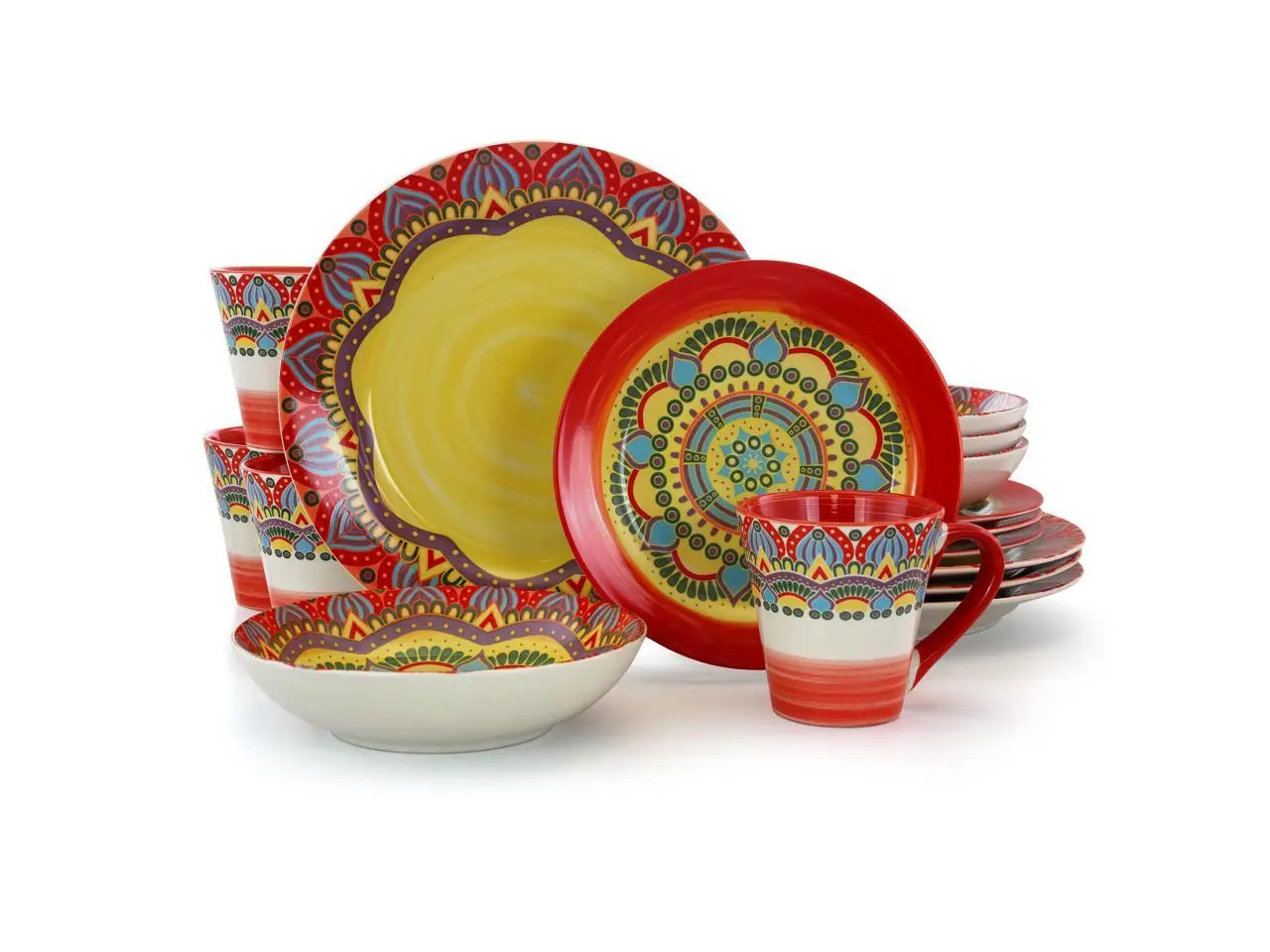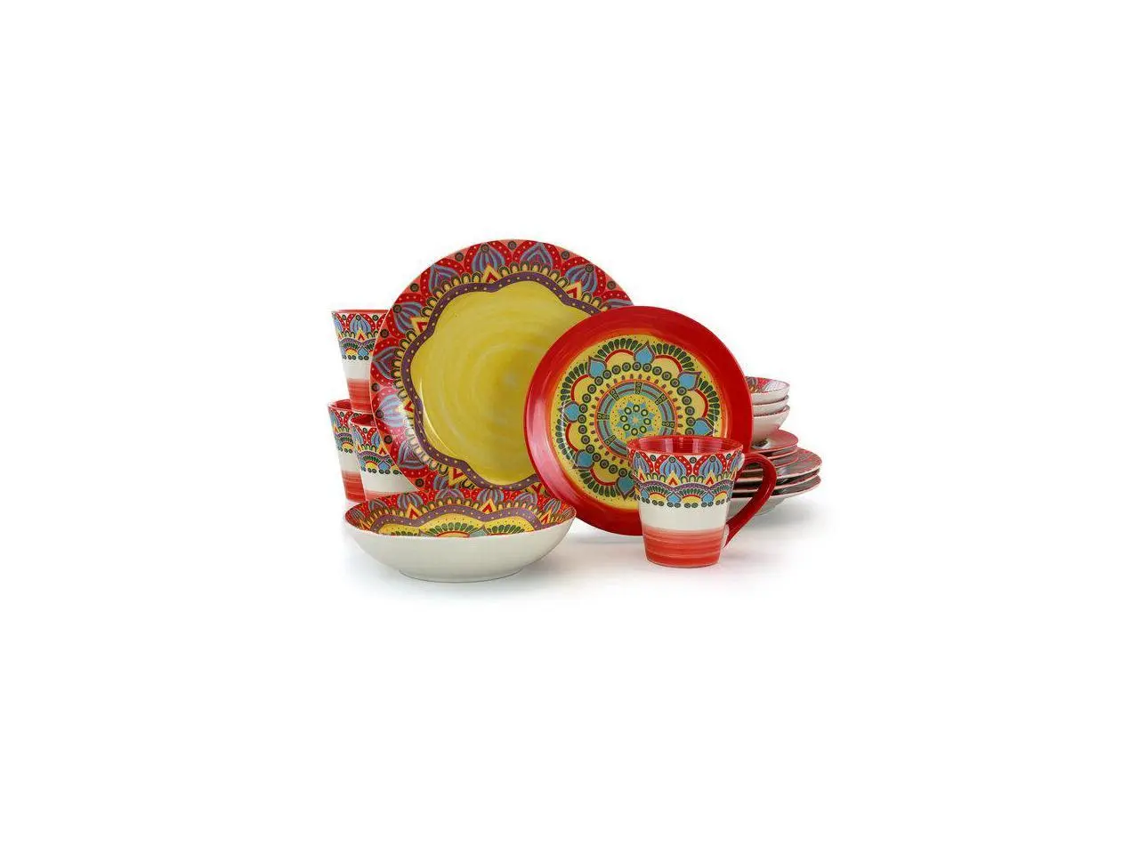 The Elama Zen Red Mozaik 16 Piece Dinnerware Set is a lovely addition of color for your table. Whether you choose to host a large party or enjoy an intimate meal in your home, these plates will brighten up your day with colorful and vibrant tones and intricate bohemian style. While this dish set for 4 is a wonderful way to serve many meals, it's designed to be versatile and can easily double as serving-ware. This stoneware collection is also both dishwasher and microwave safe making clean up and reheating simple and efficient.
