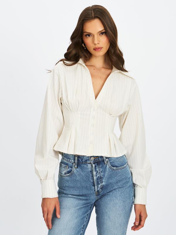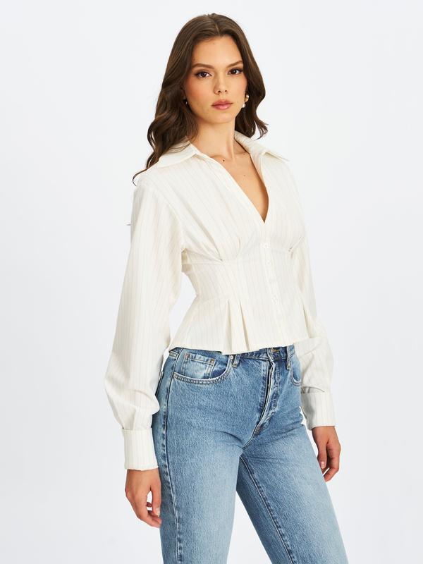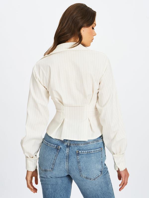 Sylvia White Pinstripe Deep V Pleated Shirt