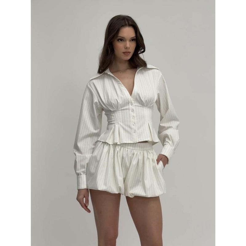 The Sylvia Top brings a refined touch to business casual attire with its crisp pinstriped design. Crafted in classic white, this pleated top features elegant long sleeves and a structured fit, making it perfect for both daily wear and formal occasions. The timeless silhouette pairs effortlessly with matching bottoms for a polished ensemble.