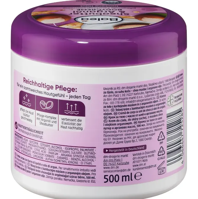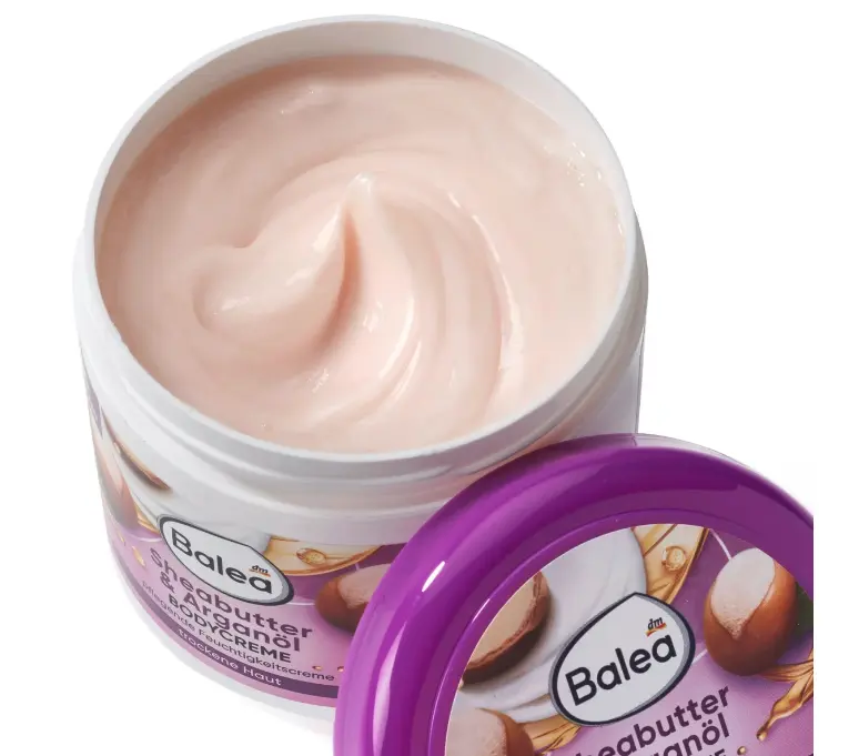 The Balea body cream with shea butter and argan oil is ideal for dry skin and makes it noticeably supple. The body cream also provides intensive moisture for up to 48 hours. The care complex with argan oil and shea butter can improve the elasticity of the skin and leaves a pleasantly scented feeling on the skin. The formula does not contain any microplastics or water-soluble, purely synthetic polymers.