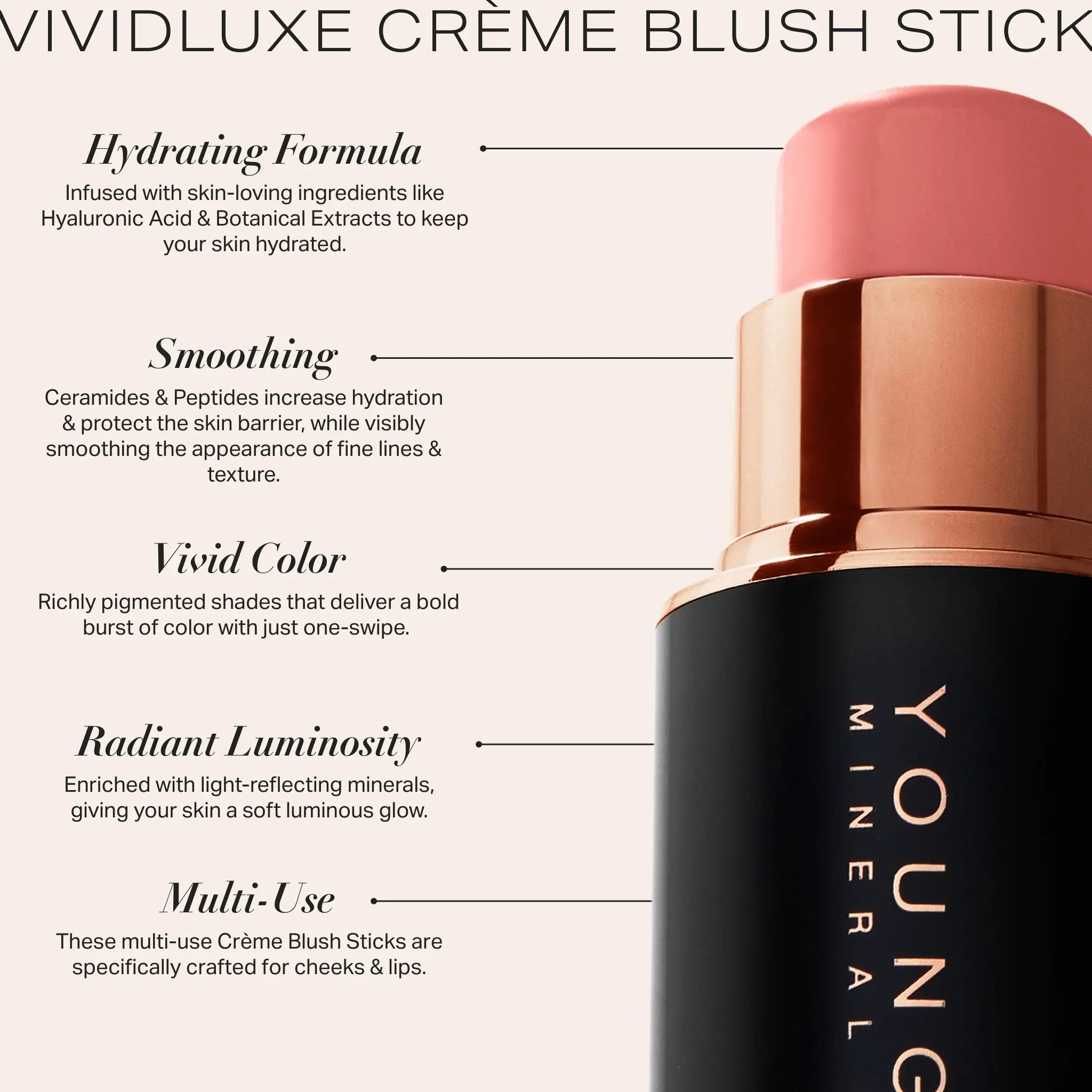 The YB VividLuxe Crème Blush Stick with Bag Charm is your new favorite on-the-go beauty essential — a stunning accessory and a skin-loving cream blush in one. Clip it to your bag, swipe it on your cheeks or lips, and glow anywhere, anytime. Available in 10 vivid, buildable shades.