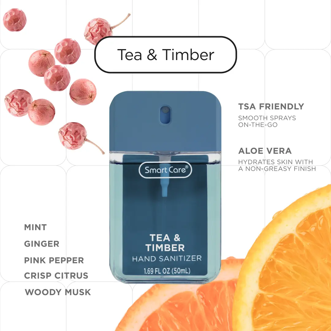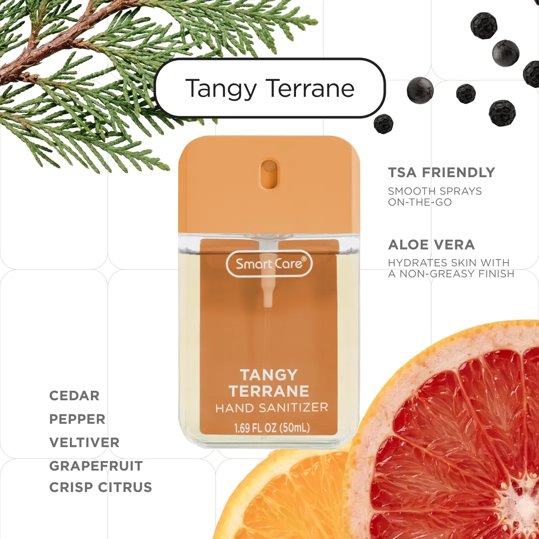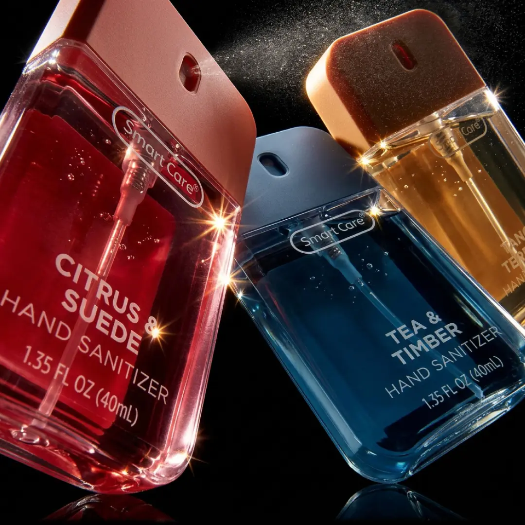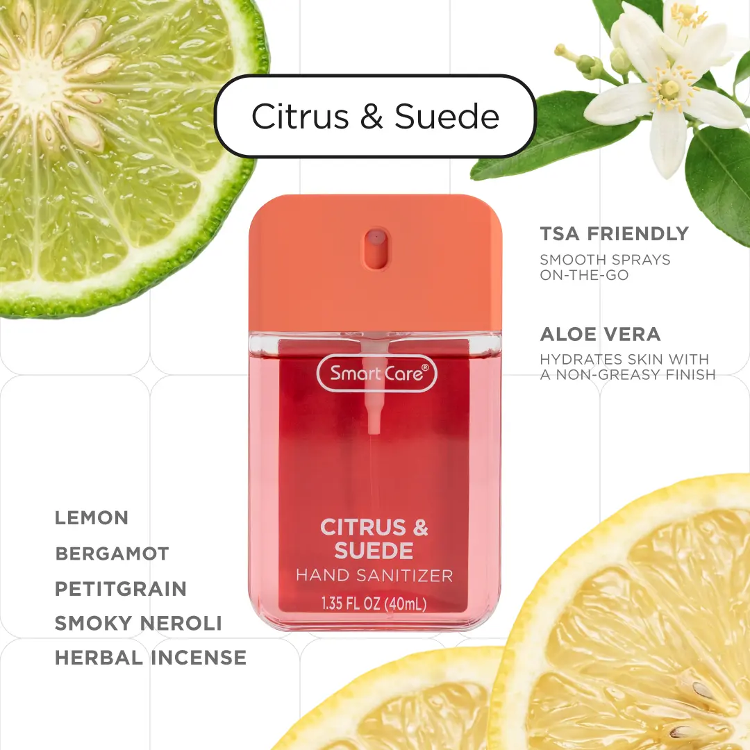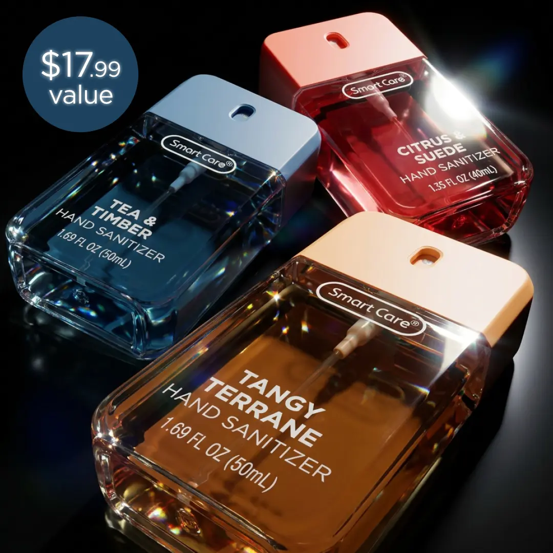 Meet the Smart Care Luxury Hand Sanitizer Spray, your new everyday essential. This compact 1.35 ounce spray is perfect for staying germ free wherever you are. The easy to use spray nozzle delivers a non sticky, even application with every spritz, killing 99% of germs in seconds. This Pour Homme Bundle includes Tangy Terrane, Tea & Timber, and Citrus & Suede, curated for those who prefer bold, clean, masculine leaning fragrances. Your go to set for keeping your hands fresh, clean, and confidently scented.