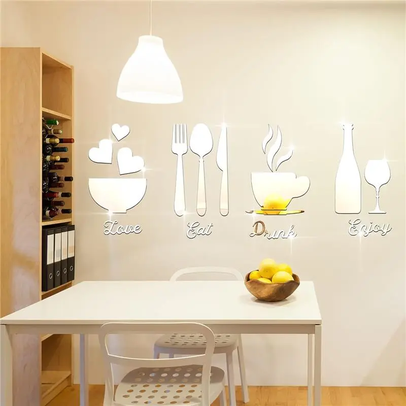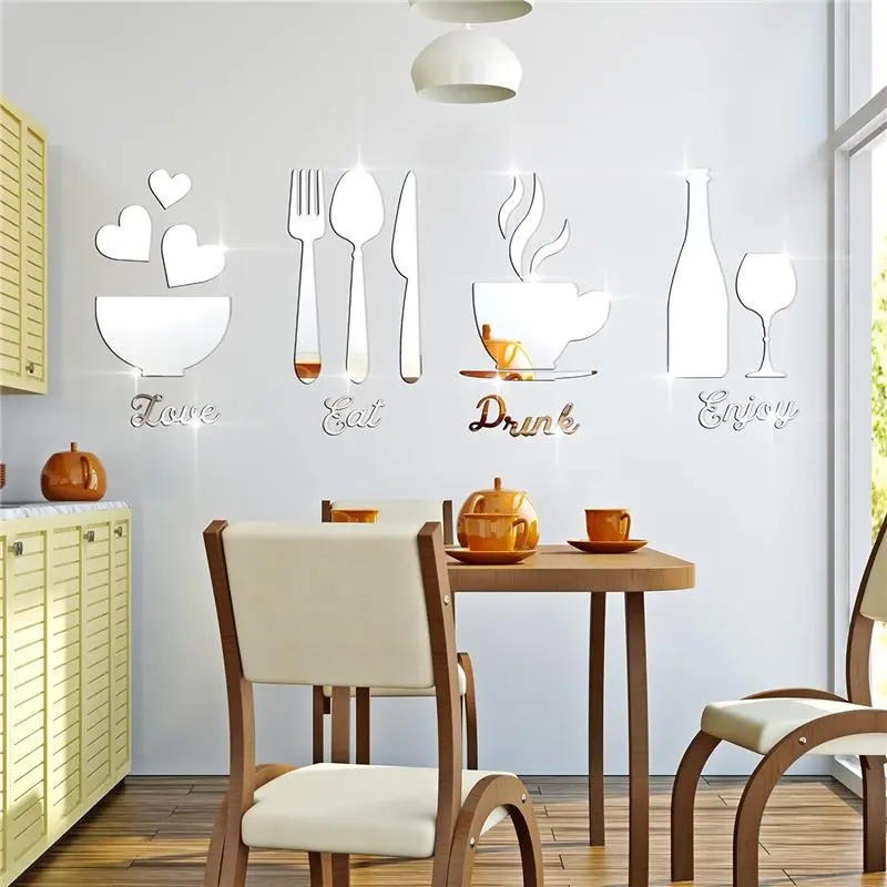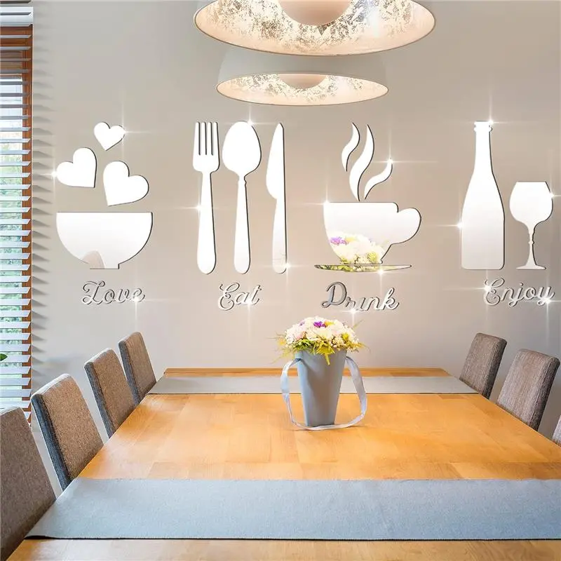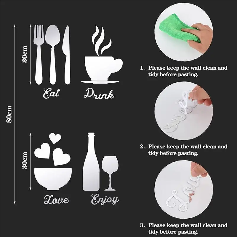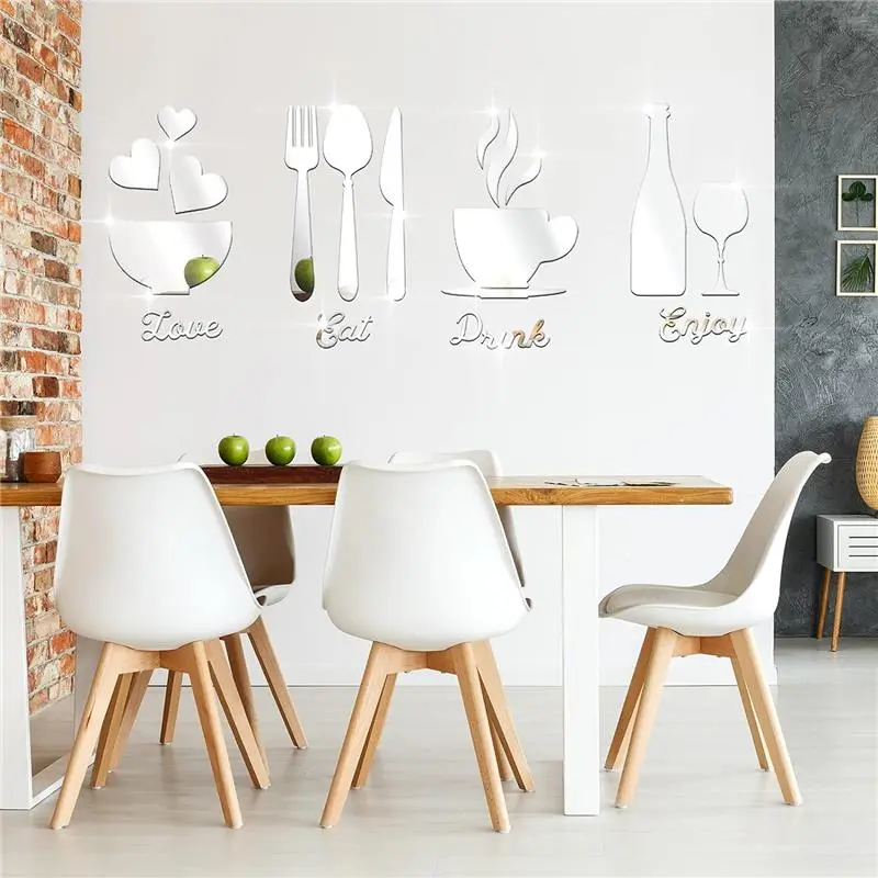· Full set of mirror wall decoration: 17 pieces of acrylic mirror wall stickers are presented, with the words of eat, drink, love and enjoy, and the patterns of 1 fork, 1 spoon, 1 goblet, 1 bottle, 5 pieces of tea cup combination, 3 pieces of love and 1 bowl; A nice combination will bring nice appetite and become a delicate decoration of kitchen and dining room