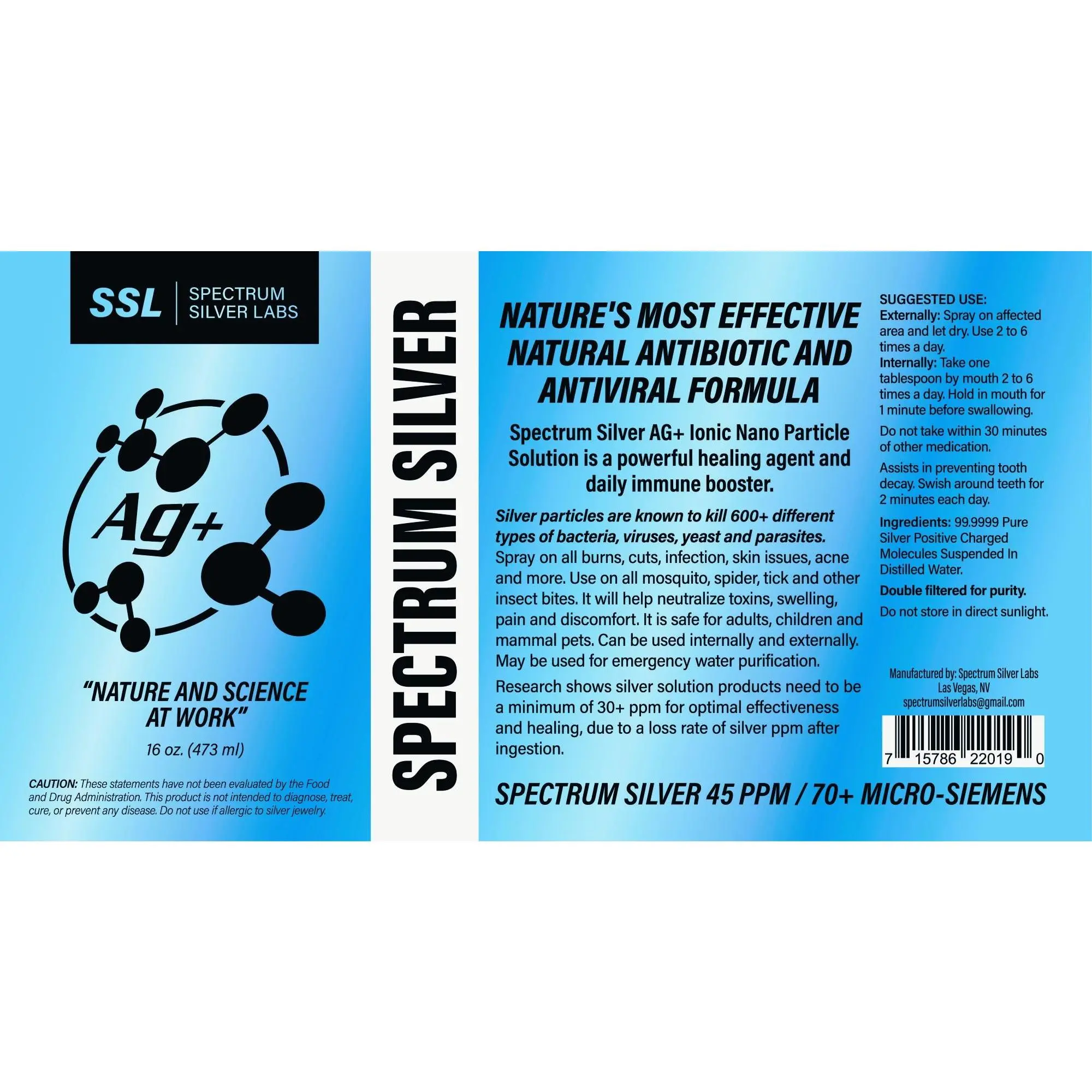 Spectrum Silver AG+ is made with great care and attention to quality. It is created with the highest quality investment grade silver bars .9999 in purity. We double filter every batch before bottling for the purest solution on the market, along with a strength of 45 PPM.