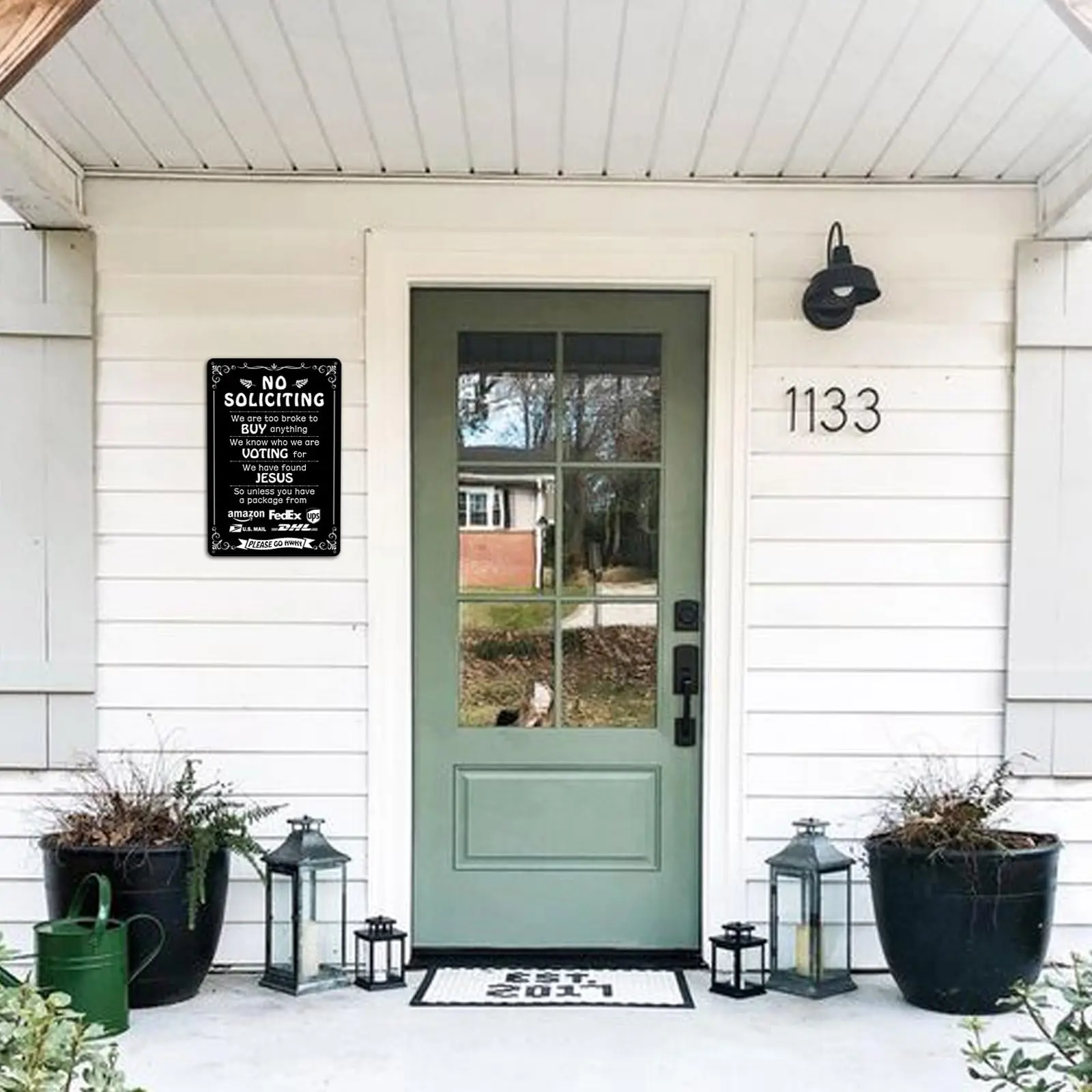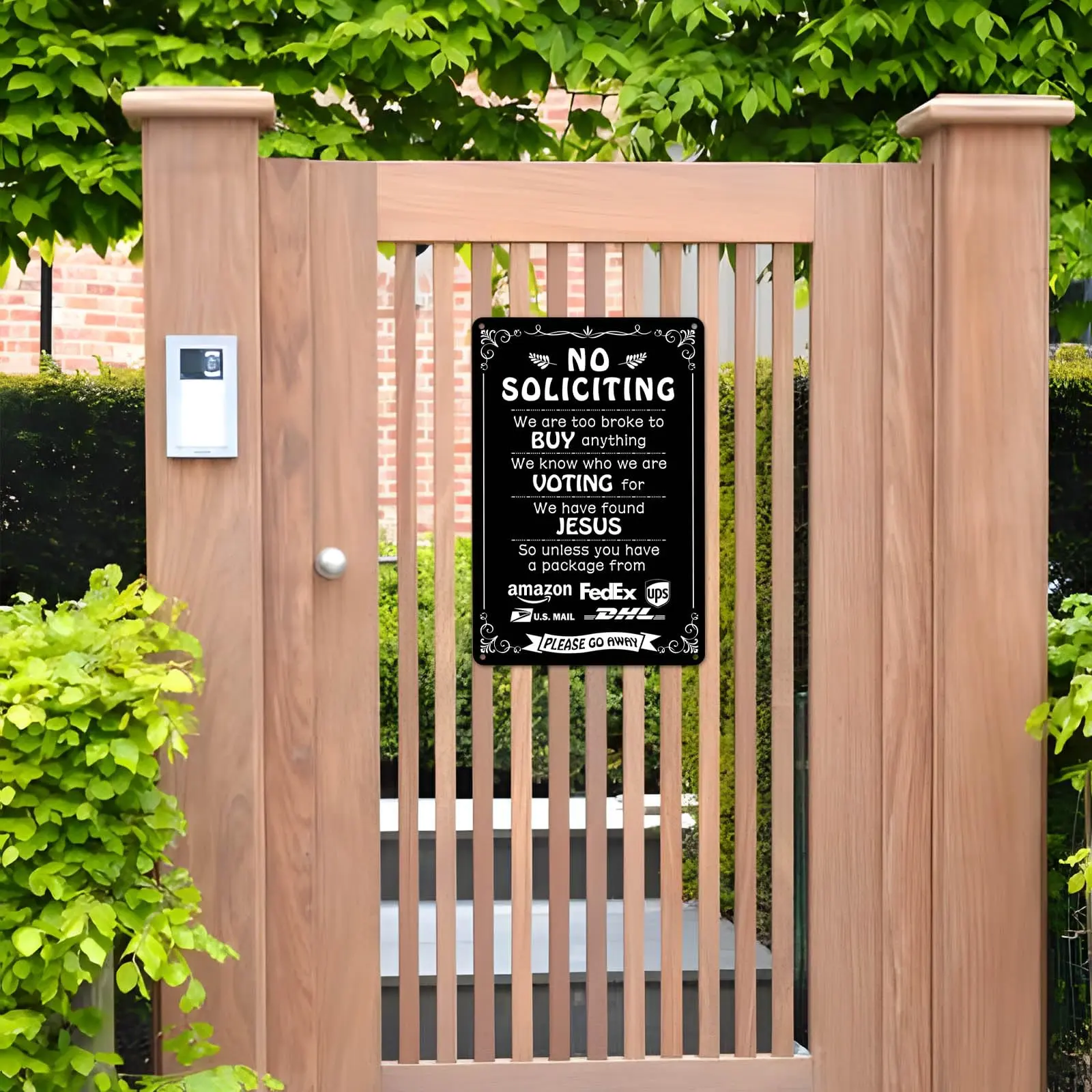 ·: This "No Soliciting" sign is designed with a humorous twist, stating "We're too broke to buy anything" and "We're voting for Jesus," making it a great conversation starter and a fun way to deter solicitors.