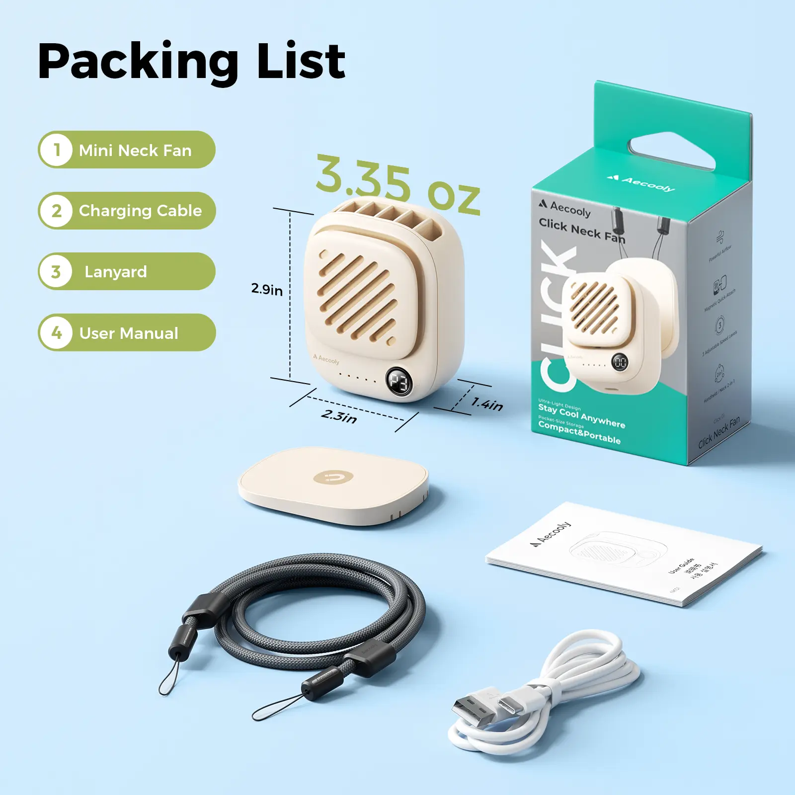 Aecooly Click 01 Portable Mini Neck Fan 95g Ultra-Light & Magnetic Clip,10H Battery Life, 3-Speed Silent Wind, Tangle-Free Design-100% Authentic Summer Essential