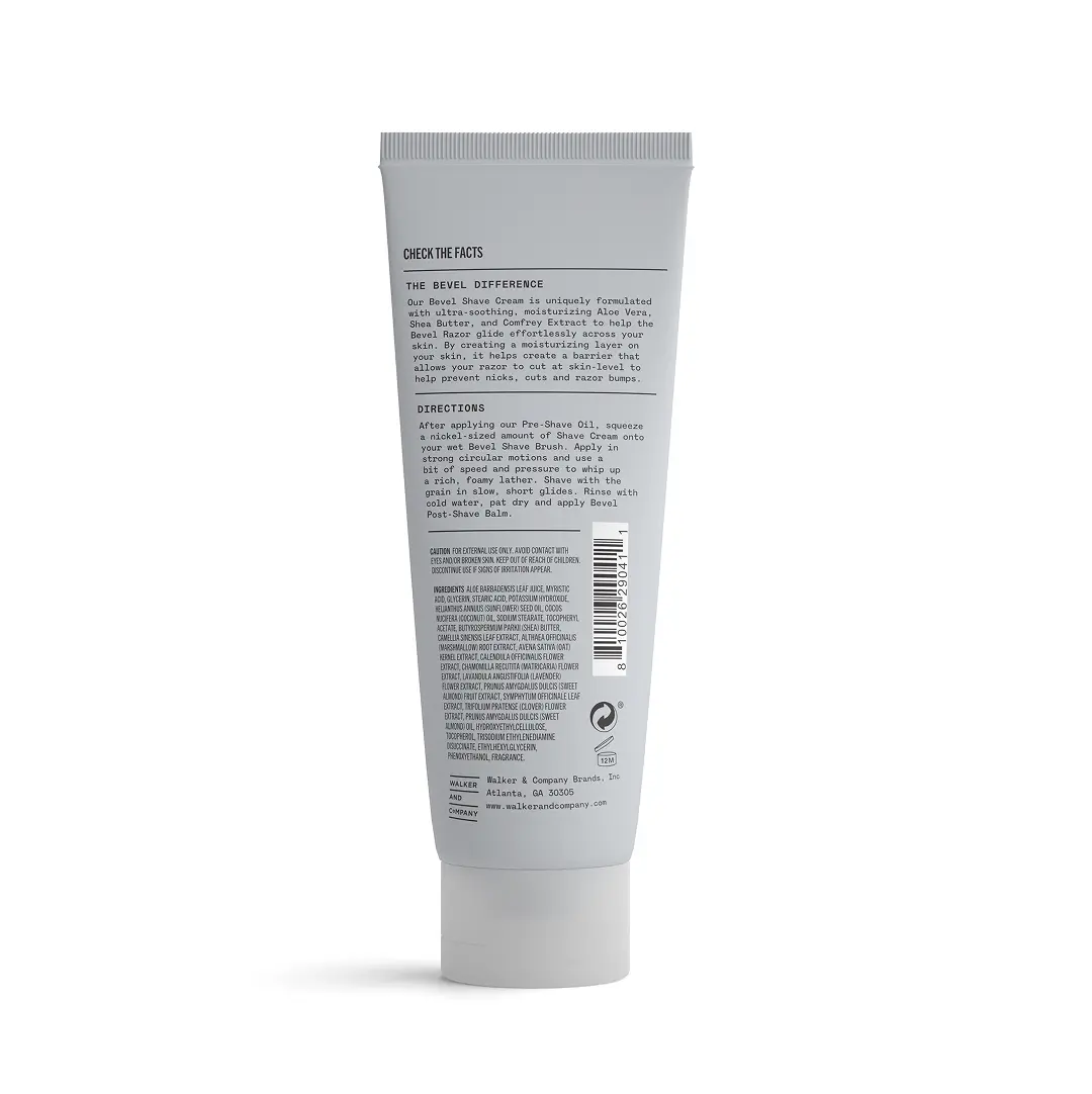 Check the labels. While most shaving creams rely on water as the key ingredient, our Bevel Shave Cream is uniquely formulated with Aloe Vera, Shea Butter, and Comfrey Extract for an ultra-soothing and moisturizing formula. This helps the Bevel Razor glide effortlessly across your sensitive skin for a comfortable shave. Creating a moisturizing, protective layer on your skin allows your razor to cut at skin-level preventing nicks, cuts, and razor bumps.