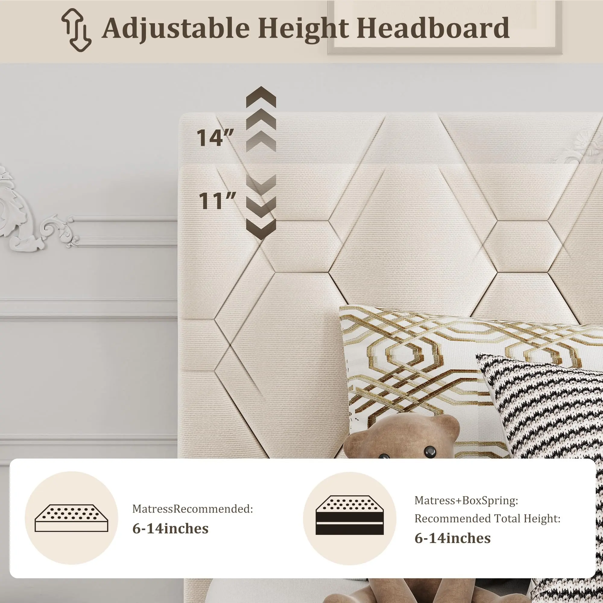 【Adjustable Headboard】: Adjustable upholstered headboard ensures a fully connection with the mattress, which is more stronger and can prevent your mobile phone or other small things falling down to the floor.Fit perfectly for a mattress of 8.3-12.2 inches