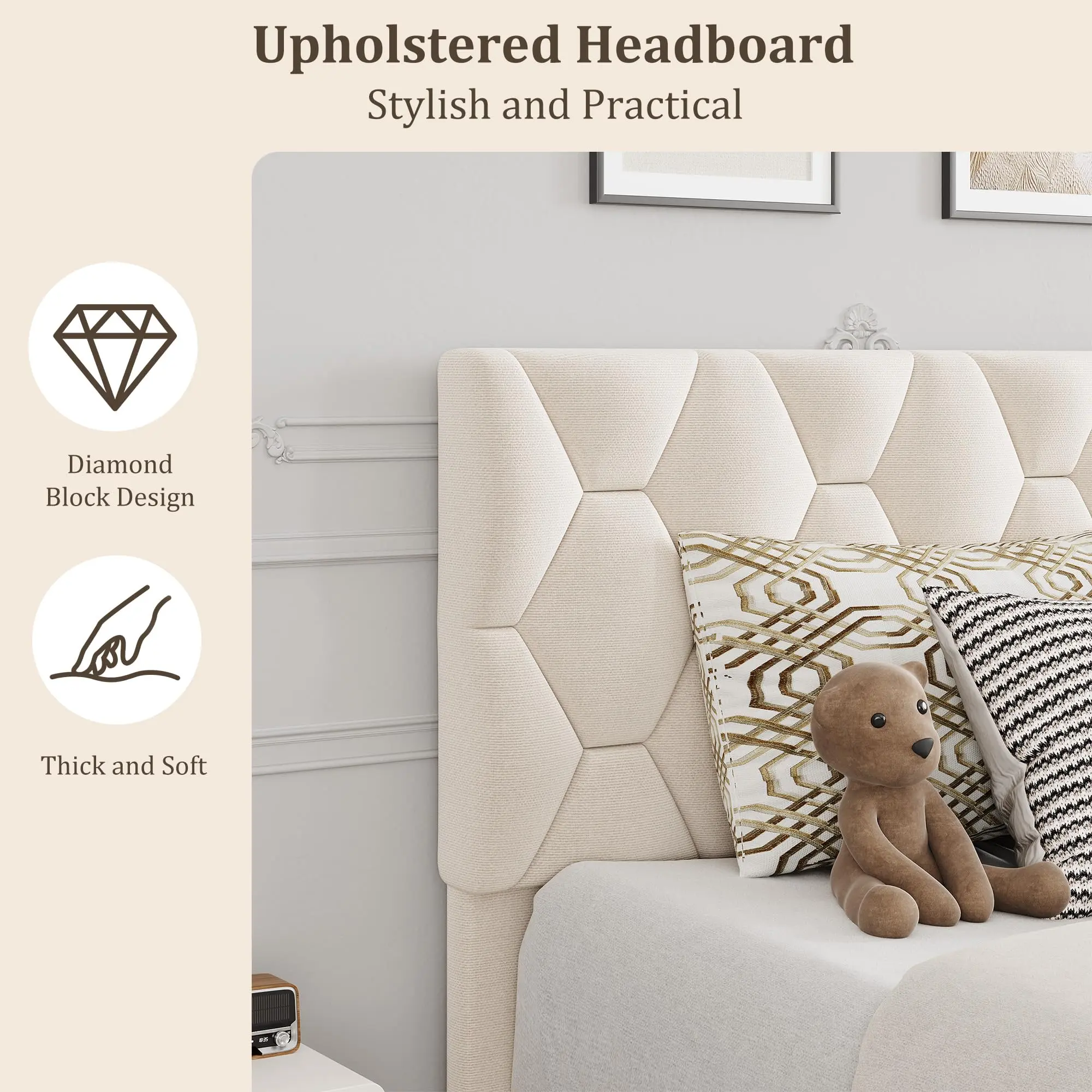 【Modern Elegance】: Featuring a diamond block design on the headboard, the upholstered bed frame combines contemporary style with plush comfort. And wide headboard not only adds comfort but also completes your contemporary aesthetic. Its foam-padded upholstery offers supportive comfort while relaxing