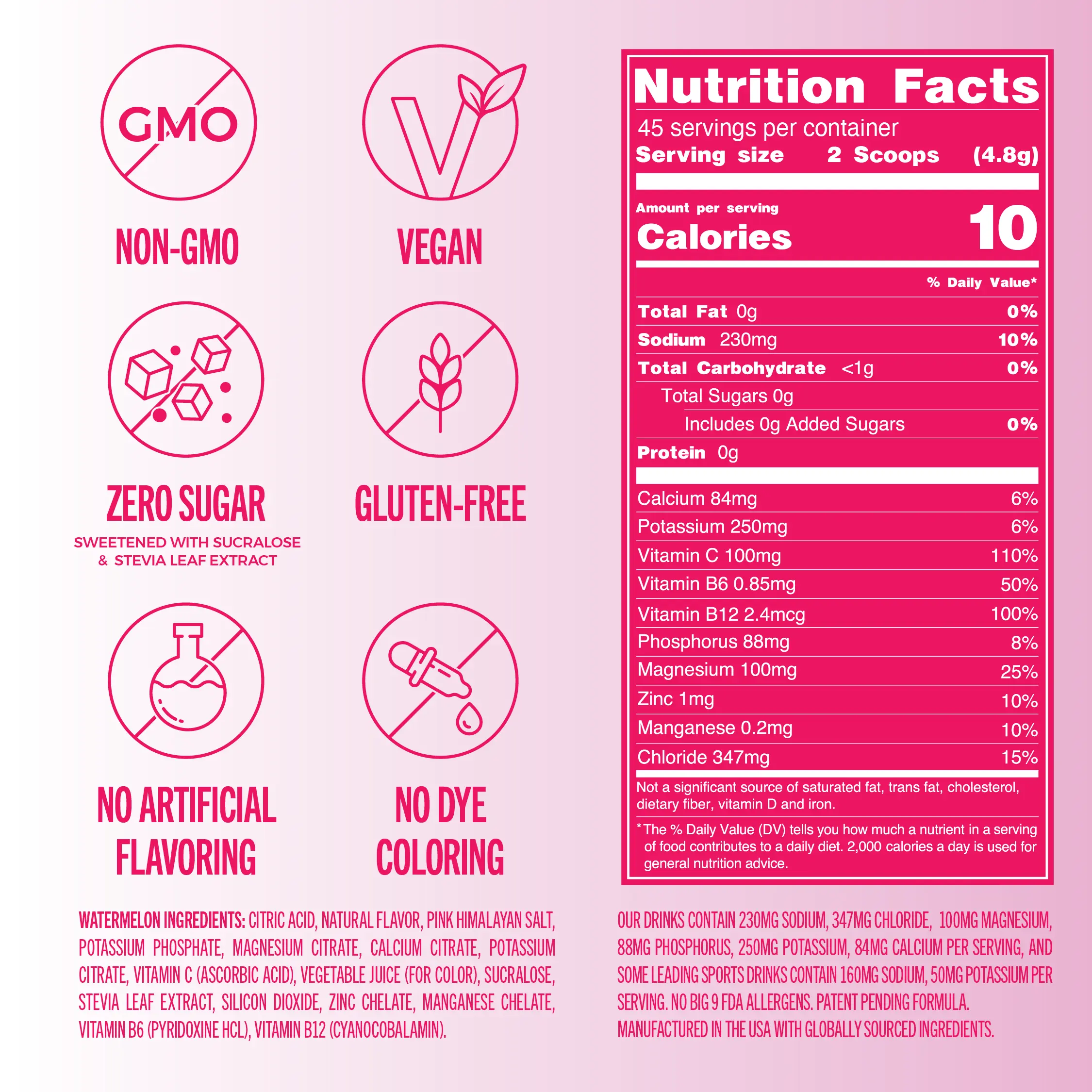 Trevi Sugar Free Watermelon Electrolyte Drink MixJuicy, refreshing watermelon flavor that hydrates as good as it tastes. 🍉💧• Fuel your body with 7 essential vitamins & minerals, 0g sugar, and 3x the electrolytes to keep you going strong.• 6 key electrolytes: magnesium, sodium, potassium, chloride, phosphorus, and calcium. These support hydration, recovery, and overall performance.• Clean & conscious: Non-GMO, vegan, gluten free, no artificial flavors, and no dyes.• Flavor versatility: 1 serving in 16oz for a strong flavor, or up to 40oz in your favorite tumbler for a subtle flavor. 🥤• Made in the USA with globally sourced ingredients. Patent-pending formula.• Perfect for workouts, travel, hot days, recovery, wellness, or just an everyday boost. With Trevi, you get refreshing taste plus serious function.• Every purchase gives back: 10% of profits go directly to non-profit partners, so your hydration helps others too!💧