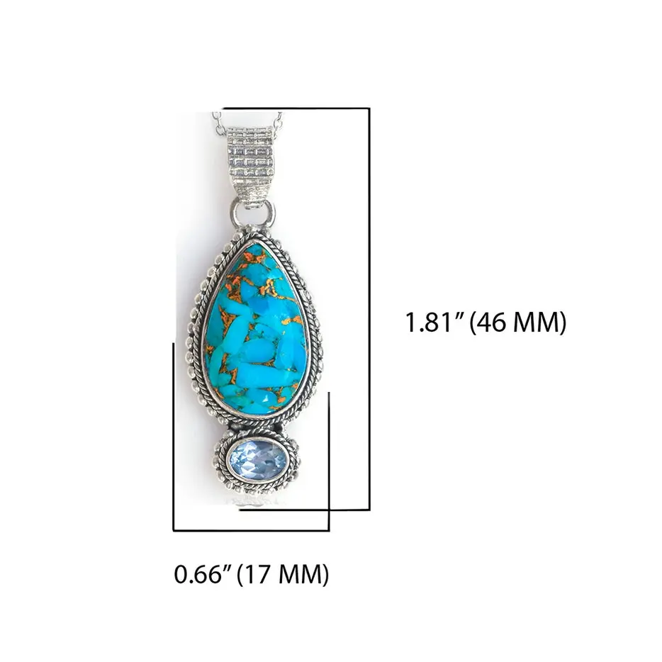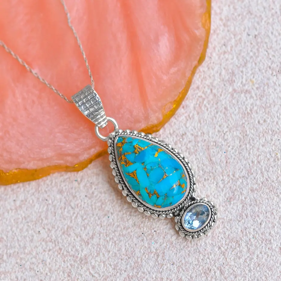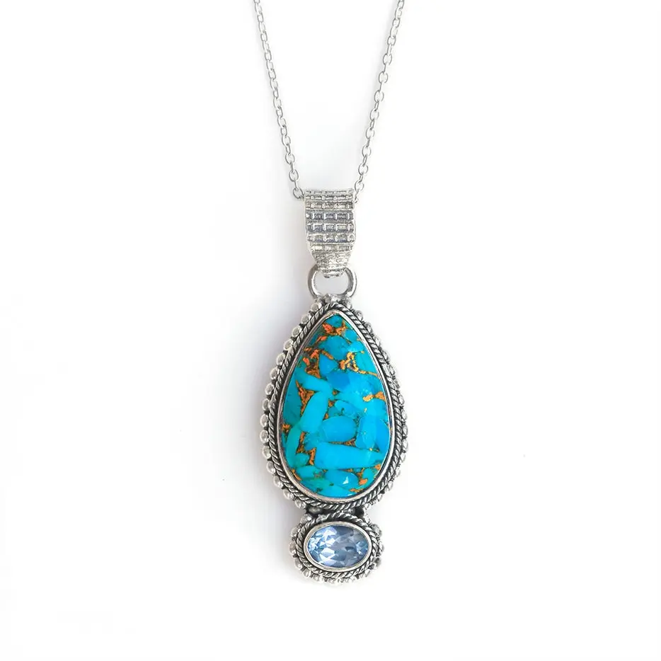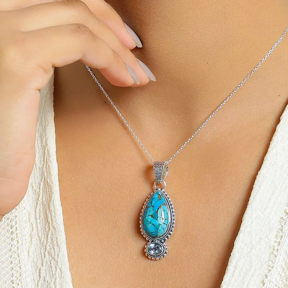 Crafted in India by skilled artisans, this women's necklace features a blue copper turquoise gemstone set in solid 925 sterling silver. Add a touch of elegance to any outfit with this handcrafted piece.