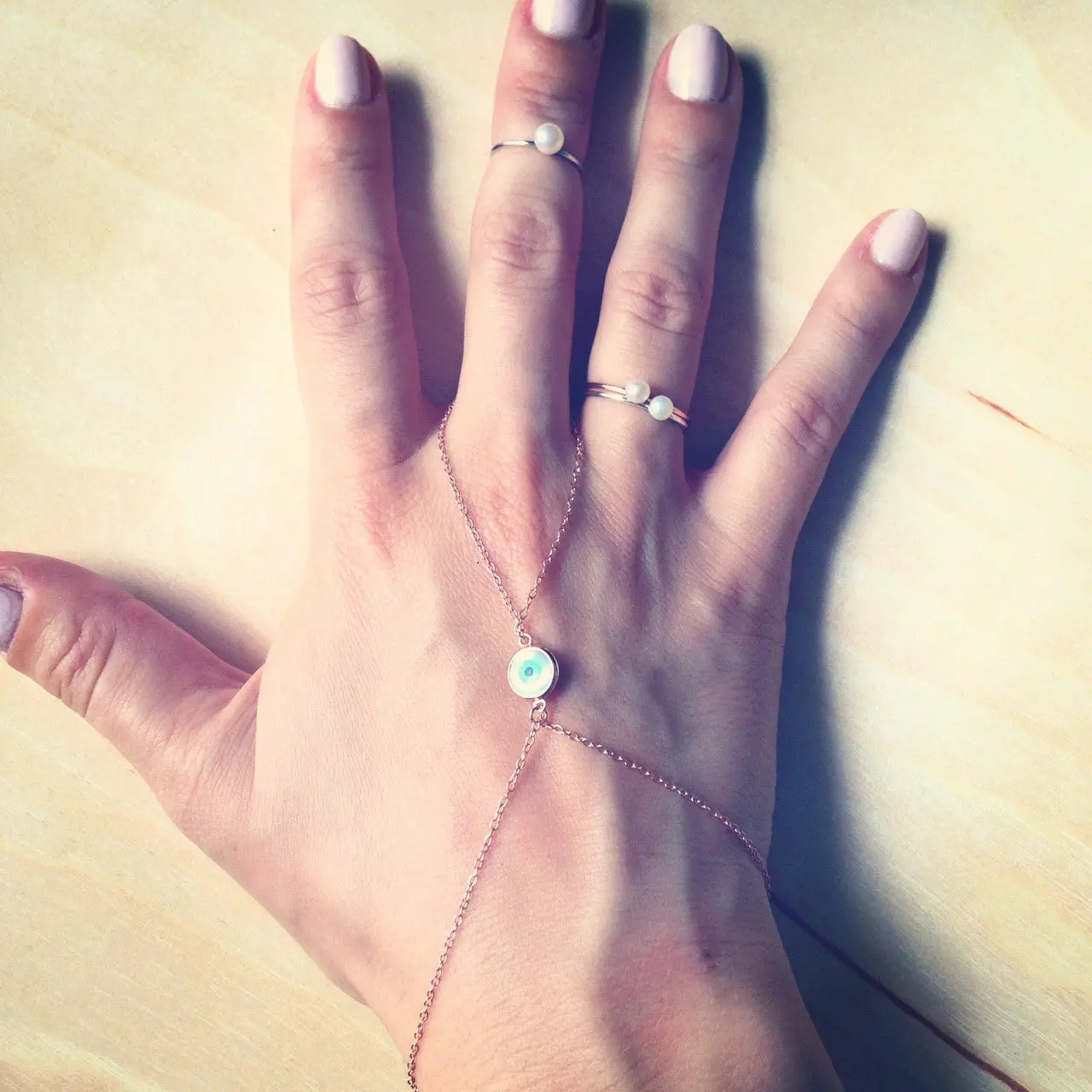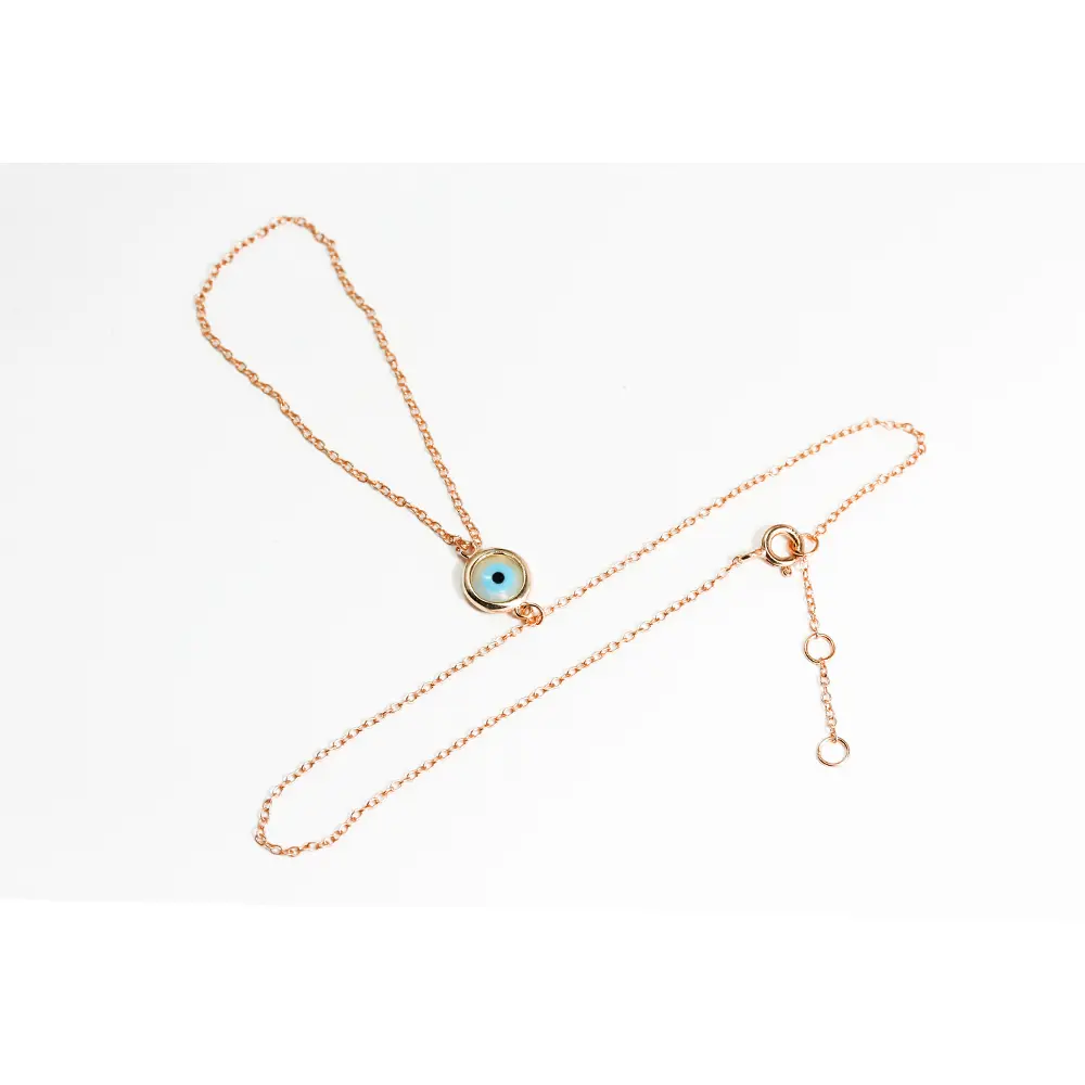 rose gold hand bracelet, made of sterling silver, plated in rose gold. fine chain featuring a blue eye at center for a special kind of protection.
