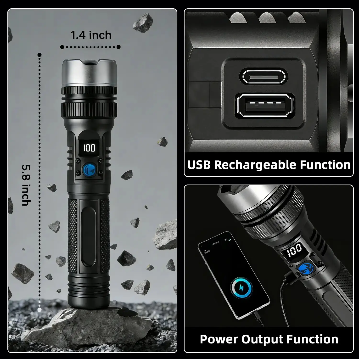 5. 2-in-1 Strong Flashlight (Power Bank),Digital display of power, Rechargeable,Zoomable, , X4Waterproof, Adjustable Brightness Flash Light for Outdoor, Emergency, Camping Accessories,Black TiktokShopSpringGlowUp