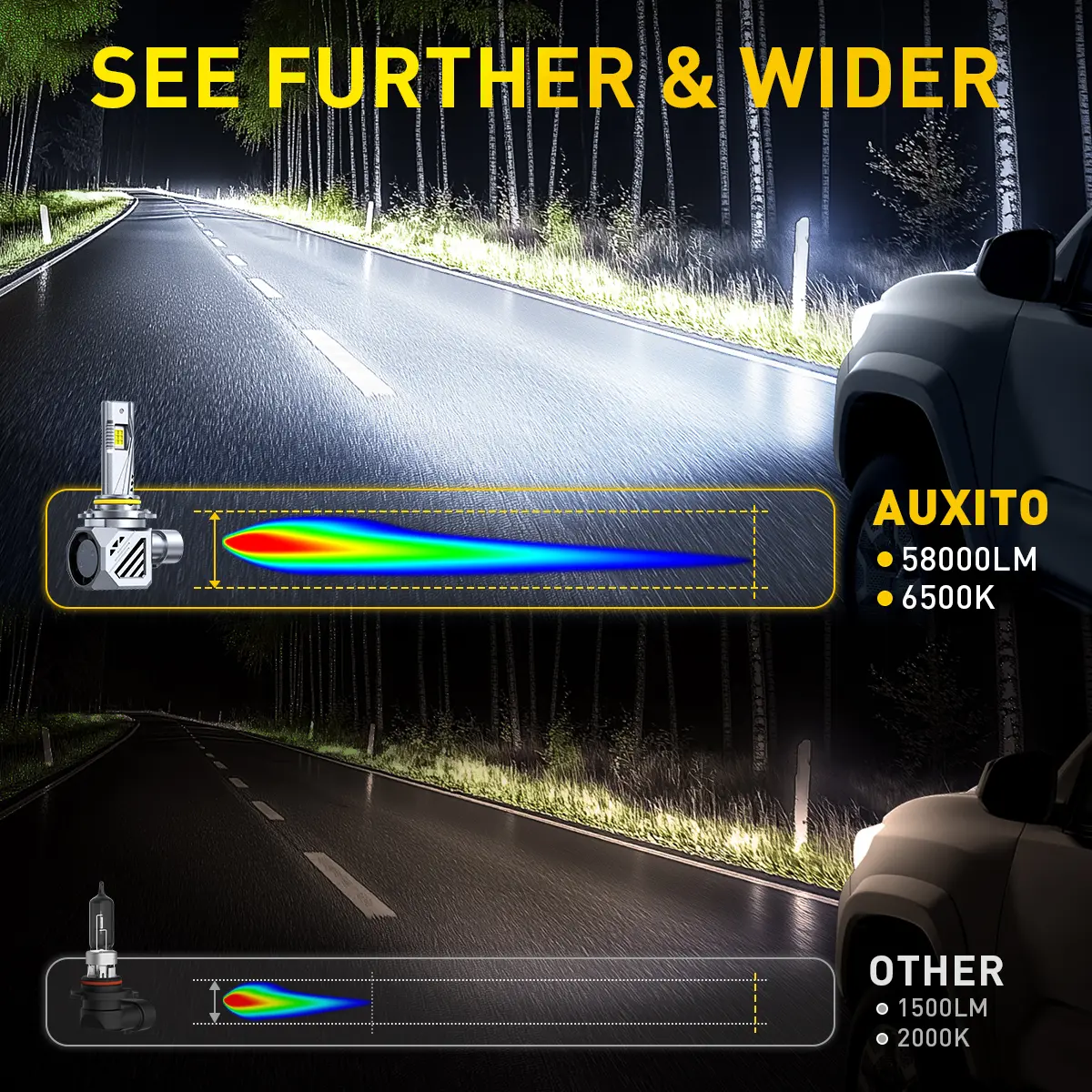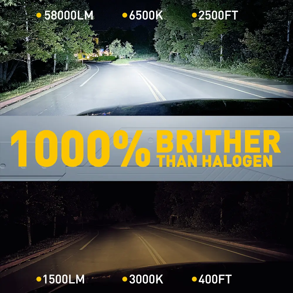【1000% BREAKTHROUGH BRIGHTNESS】Upgrade your driving experience with our high-power light bulbs, 58,000LM Super Bright 6500K Cool White.Wider driving visibility.10 times brighter than halogen bulbs. these lights provide reliable and efficient illumination for optimal nighttime driving.