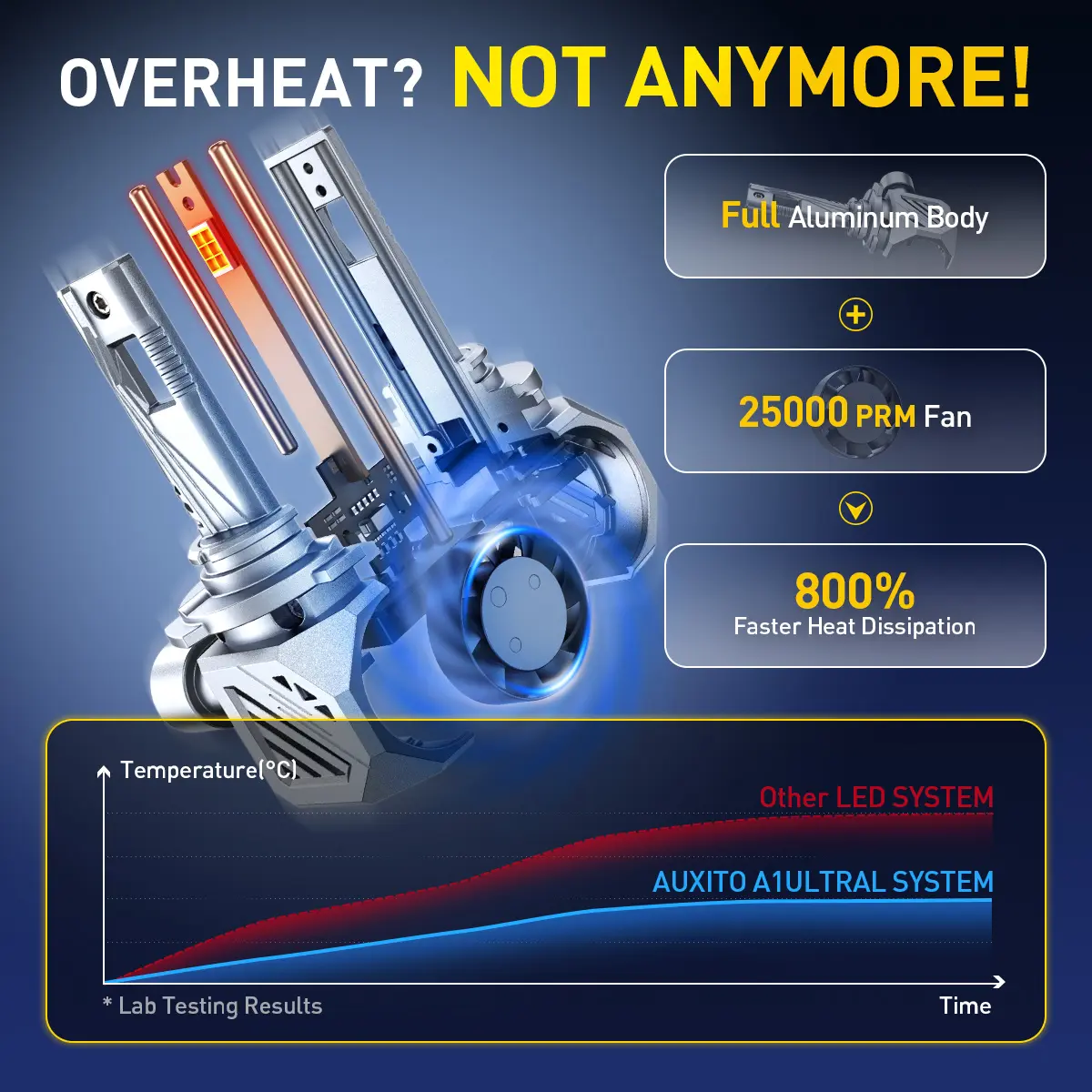 【UNMATCHED POWERFUL PERFORMANCE】Well-built premium aviation aluminum body, thermostatic copper plate, and 25,000RPM superpower cooling fan form an efficient cooling system to quickly cool the lights and ensure stable and continuous operation, extending the average life of each light to 70,000Hrs.