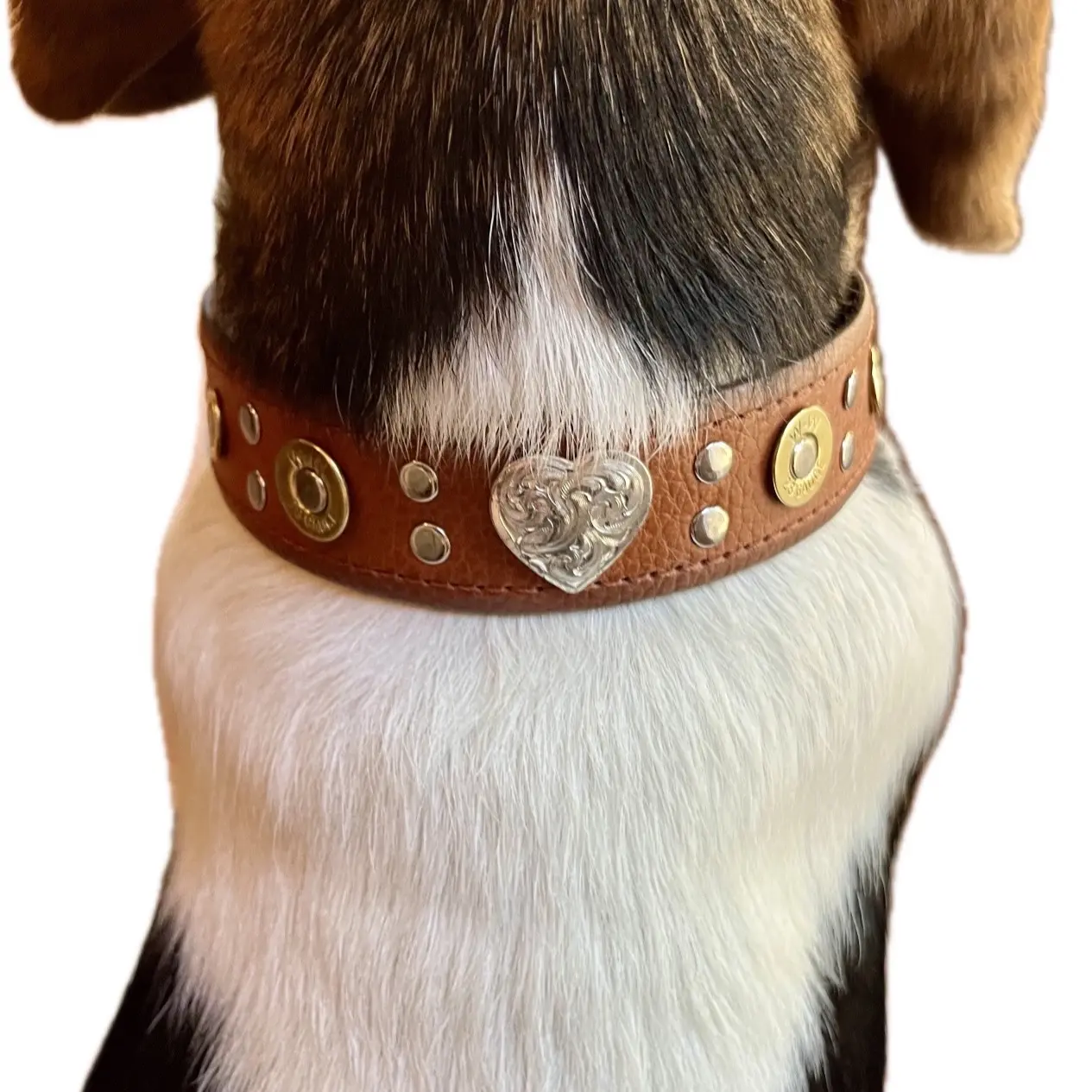 One of a kind Goodfellow & Co tan leather belt with silver buckle repurposed into a unique dog collar. Hand embellished with (1) silver Heart, (2) authentic Winchester 28 gauge shotgun shells, (2) authentic 410 shells, and (10) metal rivets. This collar is 2.5” wide and adjusts from 17”to 21”around the neck. (Medium/Large)