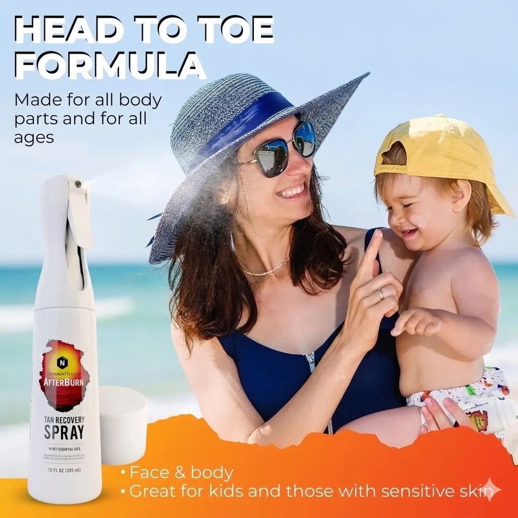 ·HEAD TO TOE CARE - Our gentle after sun mist provides comprehensive care for the face and body. AfterBurn after tan mist is a safe choice for both kids, adults and individuals with sensitive skin, offering a universal skincare solution.