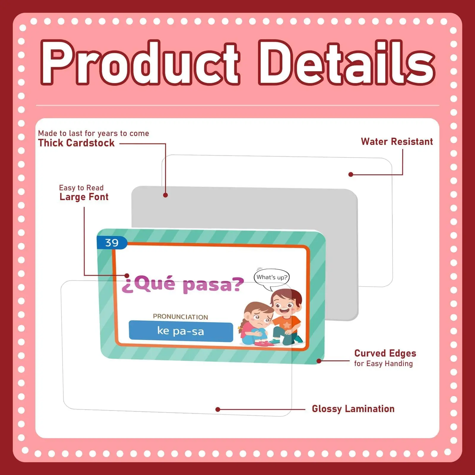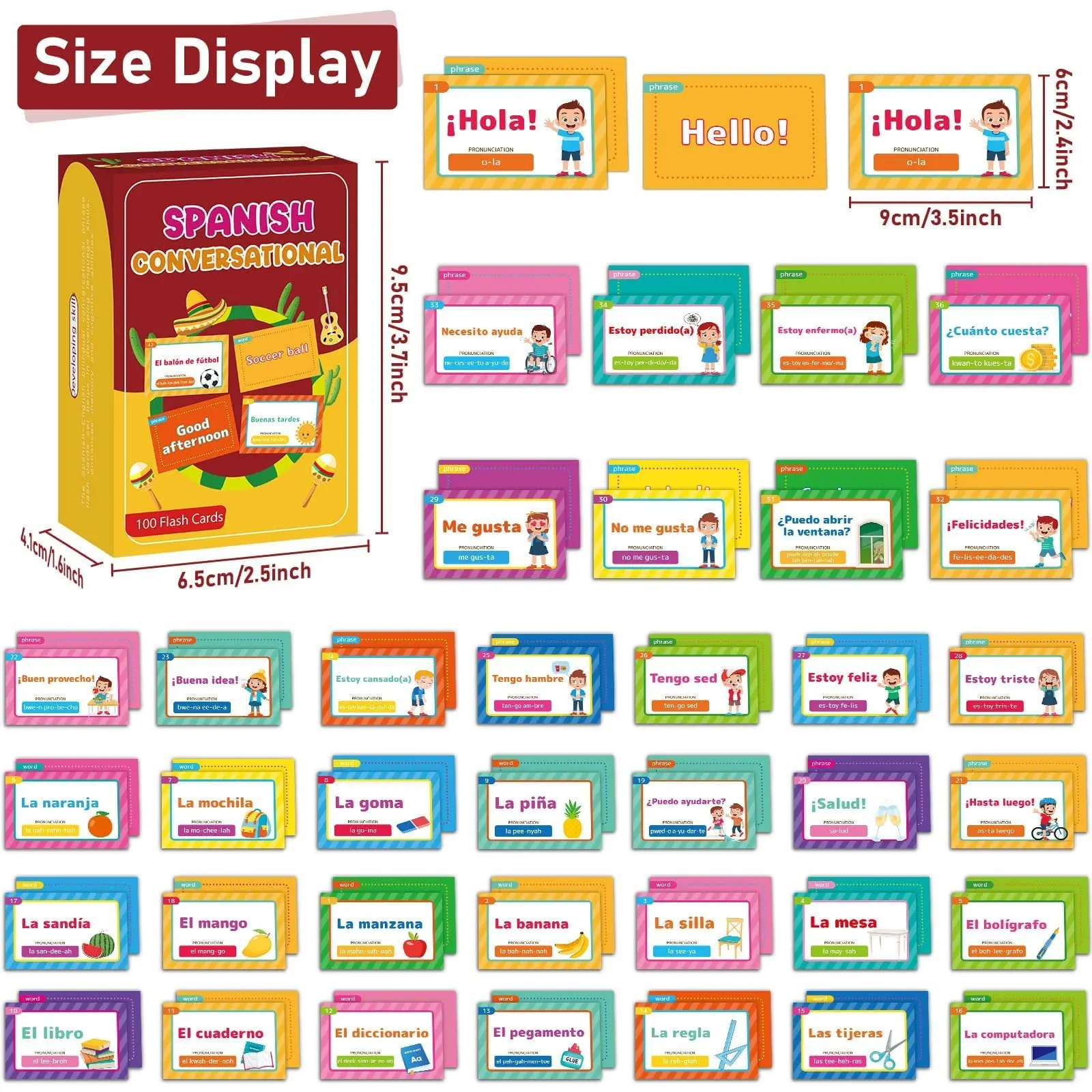 ·High quality: Each Spanish conversational phrase flash cards measures about 6 x 9 cm/2 x 3.5 inches, with smooth faces and rounded edges, and is suitable for little hands. These Spanish flash cards are made of a thick cardboard material, not easy to bend or deform, and come in a durable and reusable box allowing the set to be stored compactly. The Spanish learning cards are printed on both sides with plant-based ink, and covered with premium film, which can be wiped with a damp cloth.